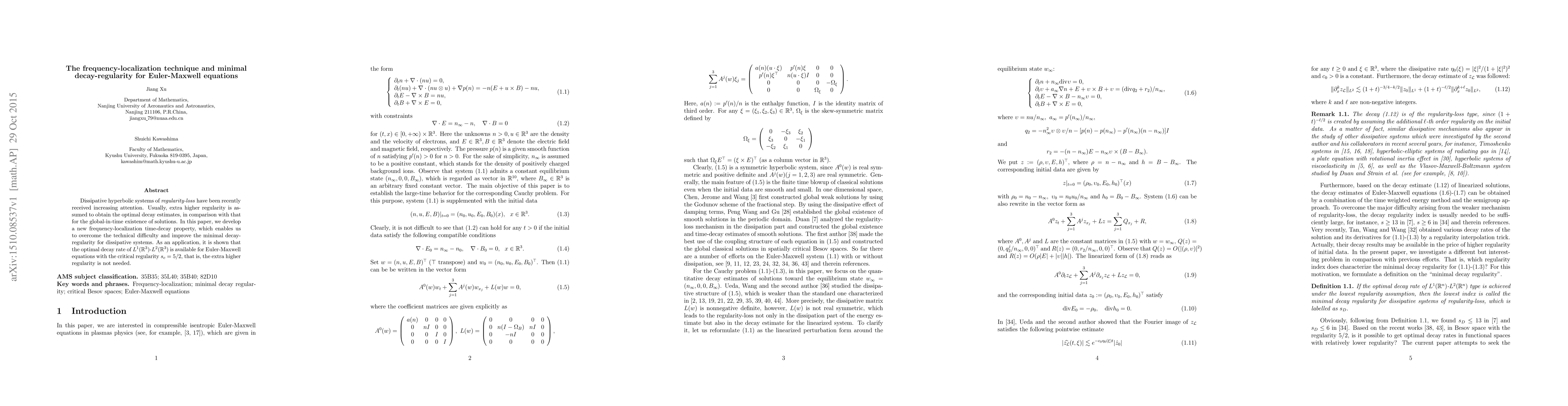Dissipative hyperbolic systems of \textit{regularity-loss} have been recently received increasing attention. Usually, extra higher regularity is assumed to obtain the optimal decay estimates, in comparison with that for the global-in-time existence of solutions. In this paper, we develop a new frequency-localization time-decay property, which enables us to overcome the technical difficulty and improve the minimal decay-regularity for dissipative systems. As an application, it is shown that the optimal decay rate of $L^1(\mathbb{R}^3)$-$L^2(\mathbb{R}^3)$ is available for Euler-Maxwell equations with the critical regularity $s_{c}=5/2$, that is, the extra higher regularity is not needed.