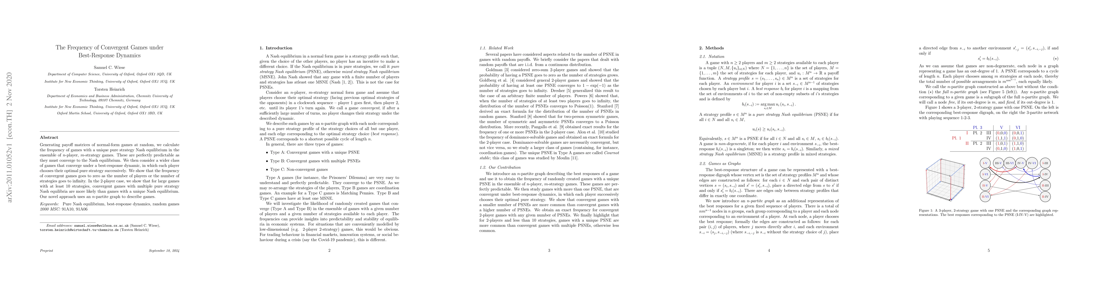 This paper investigates the frequency of games that converge to a Nash equilibrium under best-response dynamics, showing that the likelihood of such convergence decreases as the number of players or strategies increases. For large 2-player games with many strategies, it finds that games with multiple equilibria are more common than those with a single equilibrium.
