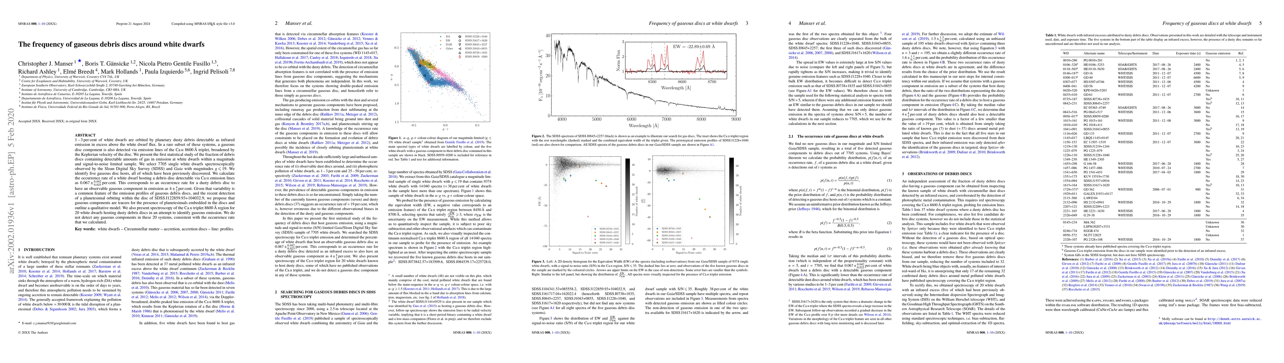1-3 per cent of white dwarfs are orbited by planetary dusty debris detectable as infrared emission in excess above the white dwarf flux. In a rare subset of these systems, a gaseous disc component is also detected via emission lines of the Ca II 8600\r{A} triplet, broadened by the Keplerian velocity of the disc. We present the first statistical study of the fraction of debris discs containing detectable amounts of gas in emission at white dwarfs within a magnitude and signal-to-noise limited sample. We select 7705 single white dwarfs spectroscopically observed by the Sloan Digital Sky Survey (SDSS) and $Gaia$ with magnitudes $g$ $\leq$ 19. We identify five gaseous disc hosts, all of which have been previously discovered. We calculate the occurrence rate of a white dwarf hosting a debris disc detectable via Ca II emission lines as 0.067$\pm$$_{0.025}^{0.042}$ per cent. This corresponds to an occurrence rate for a dusty debris disc to have an observable gaseous component in emission as 4$\pm$$_{2}^{4}$ per cent. Given that variability is a common feature of the emission profiles of gaseous debris discs, and the recent detection of a planetesimal orbiting within the disc of SDSSJ122859.93+104032.9, we propose that gaseous components are tracers for the presence of planetesimals embedded in the discs and outline a qualitative model. We also present spectroscopy of the Ca II triplet 8600\r{A} region for 20 white dwarfs hosting dusty debris discs in an attempt to identify gaseous emission. We do not detect any gaseous components in these 20 systems, consistent with the occurrence rate that we calculated.