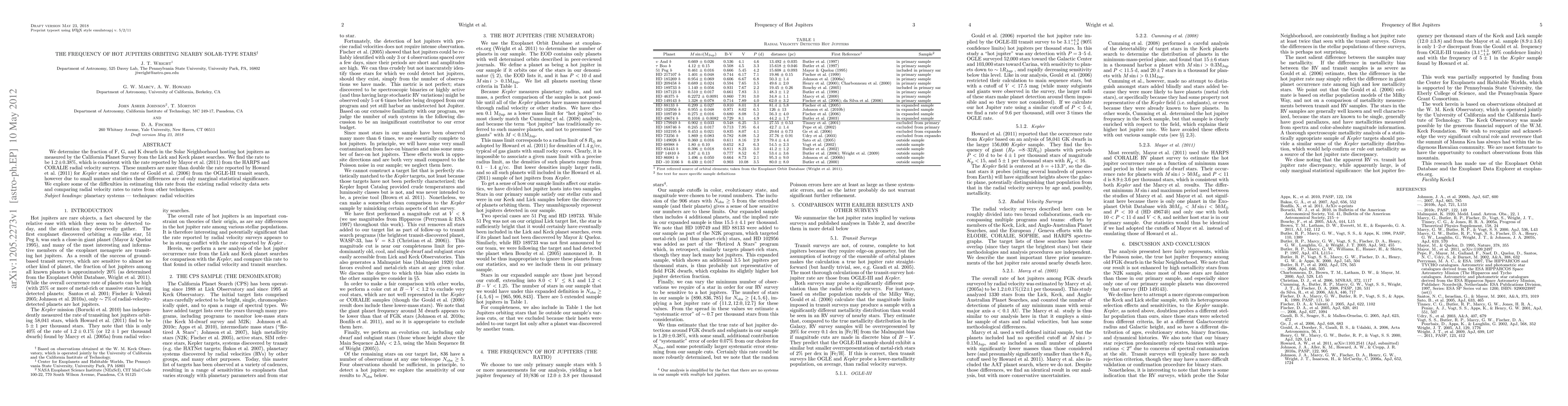 This study finds that 1.2±0.38% of nearby F, G, and K dwarf stars host hot Jupiters, a rate consistent with previous radial velocity surveys but higher than estimates from Kepler and OGLE data, though differences are statistically marginal. The paper also discusses challenges in comparing radial velocity rates with other detection methods.