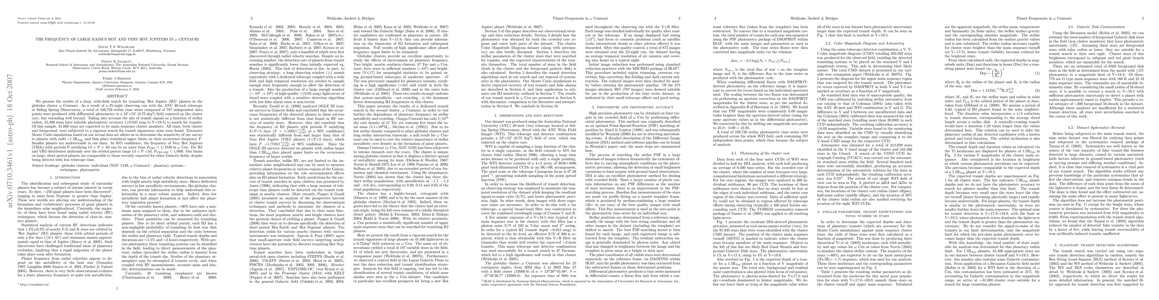 We present the results of a deep, wide-field search for transiting `Hot Jupiter (HJ)' planets in the globular cluster omega Centauri. As a result of a 25-night observing run with the ANU 40-inch telescope at Siding Spring Observatory, a total of 109,726 stellar time series composed of 787 independent data points were produced with differential photometry in a 52x52' (0.75 deg^2) field centered on the cluster core, but extending well beyond. Taking into account the size of transit signals as a function of stellar radius, 45,406 stars have suitable photometric accuracy (<=0.045 mag to V=19.5) to search for transits. Of this sample, 31,000 stars are expected to be main sequence cluster members. All stars, both cluster and foreground, were subjected to a rigorous search for transit signatures; none were found. Extensive Monte Carlo simulations based on our actual data set allows us to determine the sensitivity of our survey to planets with radii ~1.5R_Jup, and thus place statistical upper limits on their occurrence frequency 'F'. Smaller planets are undetectable in our data. At 95% confidence, the frequency of Very Hot Jupiters (VHJs) with periods P satisfying 1d