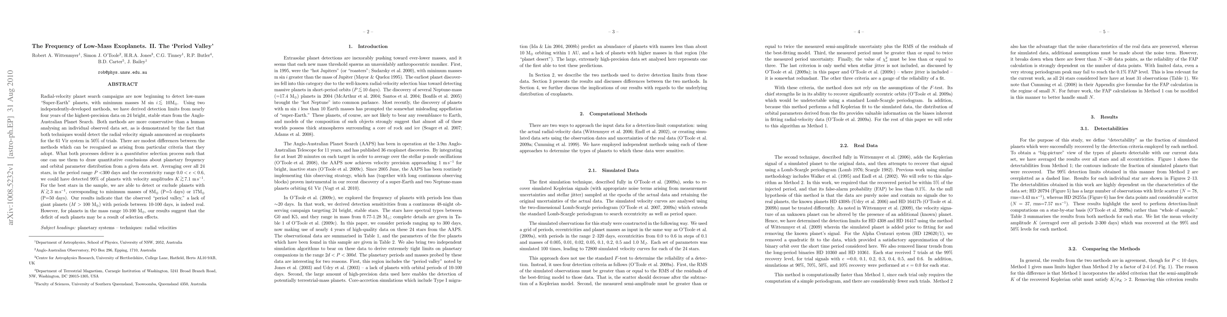 This study uses high-precision radial velocity data to detect low-mass "Super-Earth" exoplanets, finding a real "period valley" for giant planets but suggesting selection effects for mid-mass planets. The research confirms the ability to detect planets with minimum masses down to 8 Earth masses over various orbital periods.