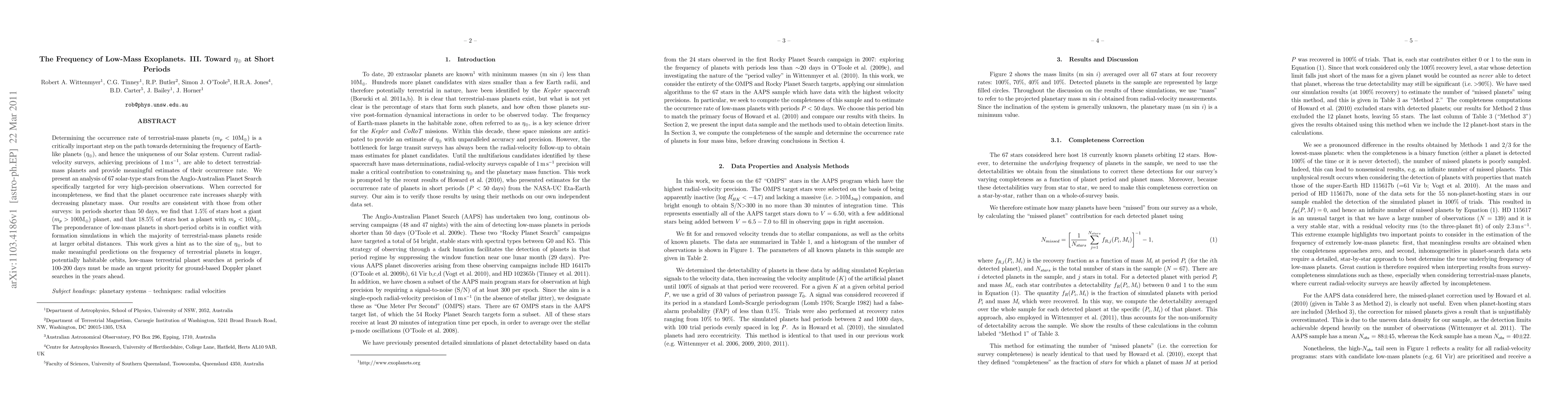 Determining the occurrence rate of terrestrial-mass planets (m_p < 10M_earth) is a critically important step on the path towards determining the frequency of Earth-like planets (eta-Earth), and hence the uniqueness of our Solar system. Current radial-velocity surveys, achieving precisions of 1 m/s, are able to detect terrestrial-mass planets and provide meaningful estimates of their occurrence rate. We present an analysis of 67 solar-type stars from the Anglo-Australian Planet Search specifically targeted for very high-precision observations. When corrected for incompleteness, we find that the planet occurrence rate increases sharply with decreasing planetary mass. Our results are consistent with those from other surveys: in periods shorter than 50 days, we find that 1.5% of stars host a giant (m_p > 100M_earth) planet, and that 18.5% of stars host a planet with m_p < 10M_earth. The preponderance of low-mass planets in short-period orbits is in conflict with formation simulations in which the majority of terrestrial-mass planets reside at larger orbital distances. This work gives a hint as to the size of eta-Earth, but to make meaningful predictions on the frequency of terrestrial planets in longer, potentially habitable orbits, low-mass terrestrial planet searches at periods of 100-200 days must be made an urgent priority for ground-based Doppler planet searches in the years ahead.