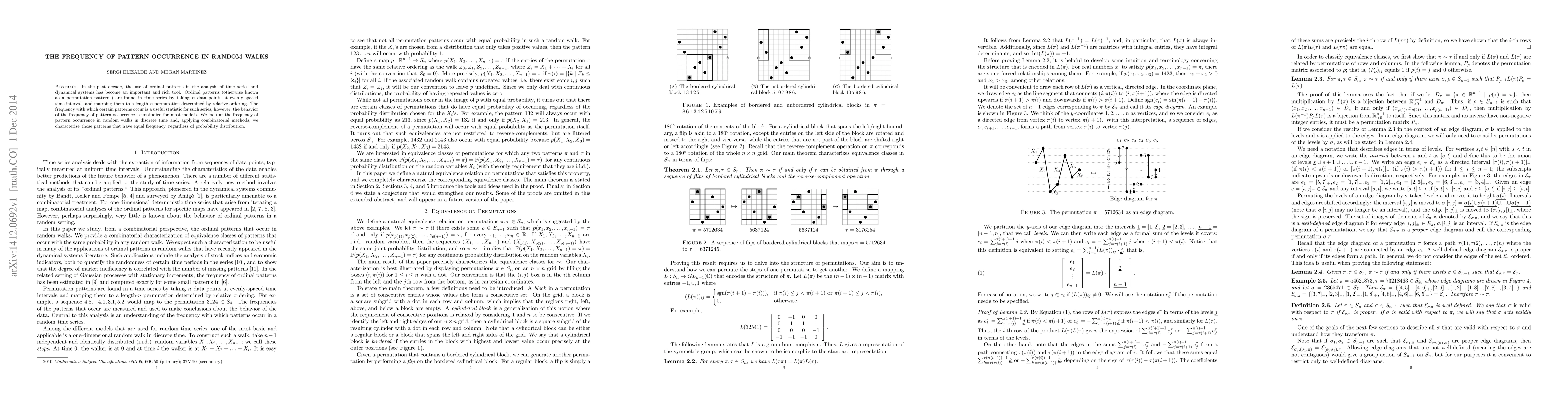 This paper explores the frequency of pattern occurrence in random walks and identifies patterns with equal frequency, regardless of probability distribution, using combinatorial methods.