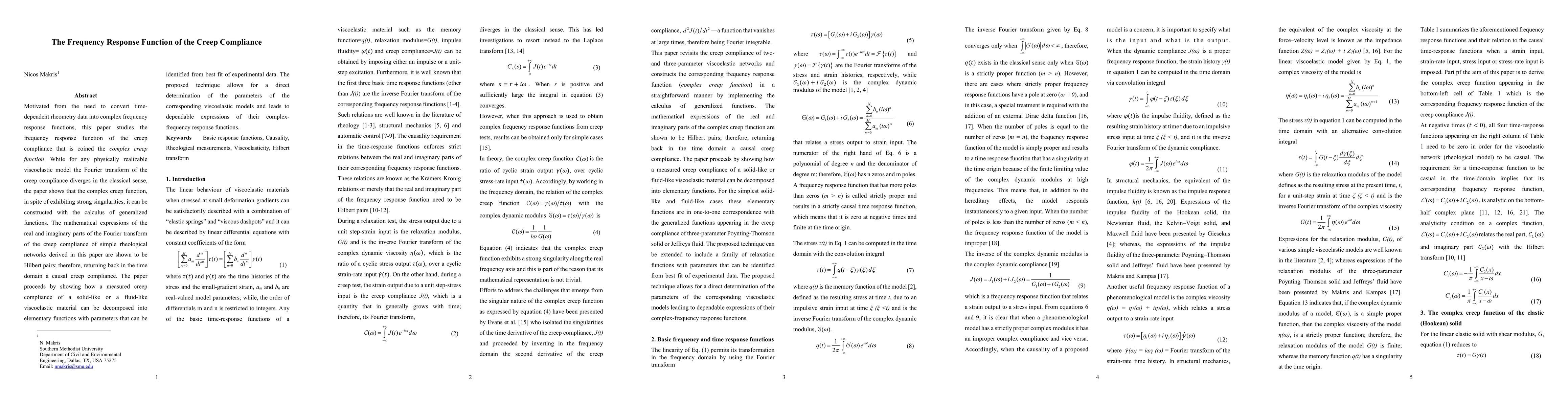 Motivated from the need to convert time-dependent rheometry data into complex frequency response functions, this paper studies the frequency response function of the creep compliance that is coined the complex creep function. While for any physically realizable viscoelastic model the Fourier transform of the creep compliance diverges in the classical sense, the paper shows that the complex creep function, in spite of exhibiting strong singularities, it can be constructed with the calculus of generalized functions. The mathematical expressions of the real and imaginary parts of the Fourier transform of the creep compliance of simple rheological networks derived in this paper are shown to be Hilbert pairs; therefore, returning back in the time domain a causal creep compliance. The paper proceeds by showing how a measured creep compliance of a solid-like or a fluid-like viscoelastic material can be decomposed into elementary functions with parameters that can be identified from best fit of experimental data. The proposed technique allows for a direct determination of the parameters of the corresponding viscoelastic models and leads to dependable expressions of their complex-frequency response functions.