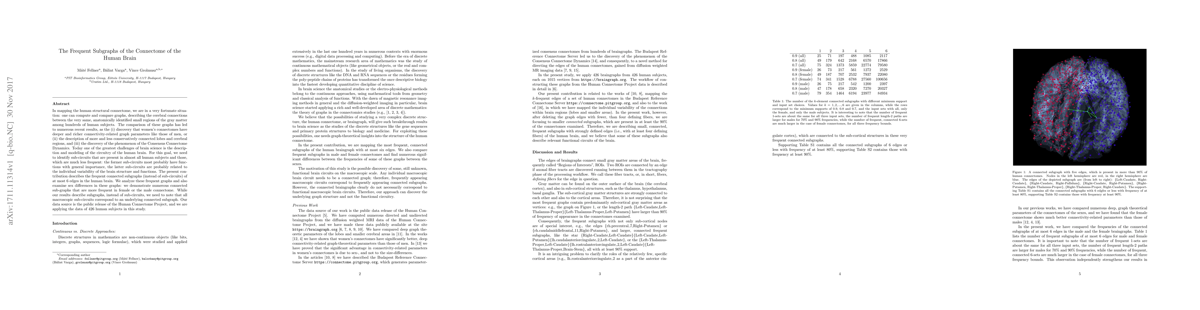 In mapping the human structural connectome, we are in a very fortunate situation: one can compute and compare graphs, describing the cerebral connections between the very same, anatomically identified small regions of the gray matter among hundreds of human subjects. The comparison of these graphs has led to numerous recent results, as the (i) discovery that women's connectomes have deeper and richer connectivity-related graph parameters like those of men, or (ii) the description of more and less conservatively connected lobes and cerebral regions, and (iii) the discovery of the phenomenon of the Consensus Connectome Dynamics. Today one of the greatest challenges of brain science is the description and modeling of the circuitry of the human brain. For this goal, we need to identify sub-circuits that are present in almost all human subjects and those, which are much less frequent: the former sub-circuits most probably have functions with general importance, the latter sub-circuits are probably related to the individual variability of the brain structure and functions. The present contribution describes the frequent connected subgraphs (instead of sub-circuits) of at most 6 edges in the human brain. We analyze these frequent graphs and also examine sex differences in these graphs: we demonstrate numerous connected sub-graphs that are more frequent in female or the male connectome. While our results describe subgraphs, instead of sub-circuits, we need to note that all macroscopic sub-circuits correspond to an underlying connected subgraph. Our data source is the public release of the Human Connectome Project, and we are applying the data of 426 human subjects in this study.