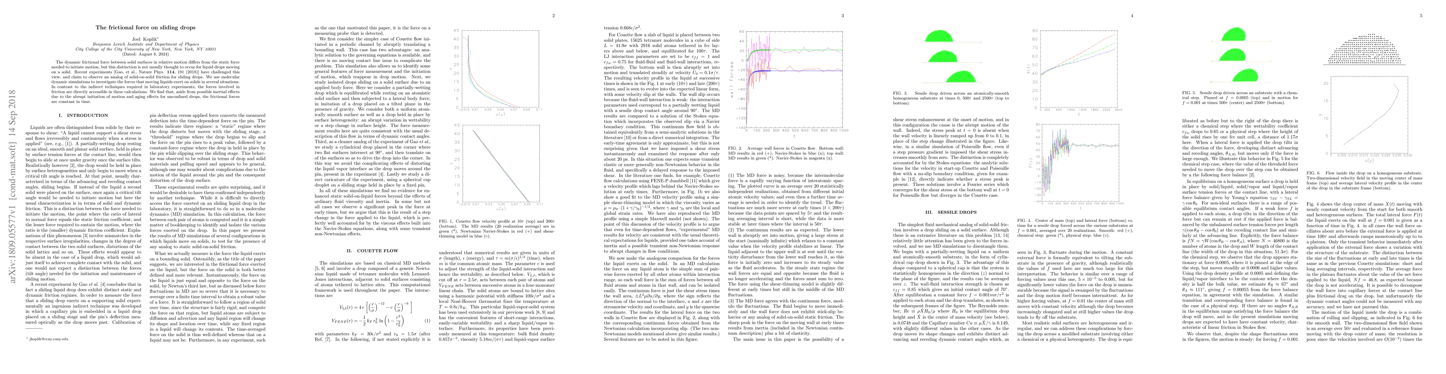 This study uses molecular dynamic simulations to investigate frictional forces exerted by sliding liquid drops on solids, finding that frictional forces are constant over time, challenging the notion that liquid drops behave differently from solids in friction scenarios. The simulations reveal that inertial and aging effects may slightly influence initial motion but do not alter the constant nature of frictional forces in steady sliding conditions.