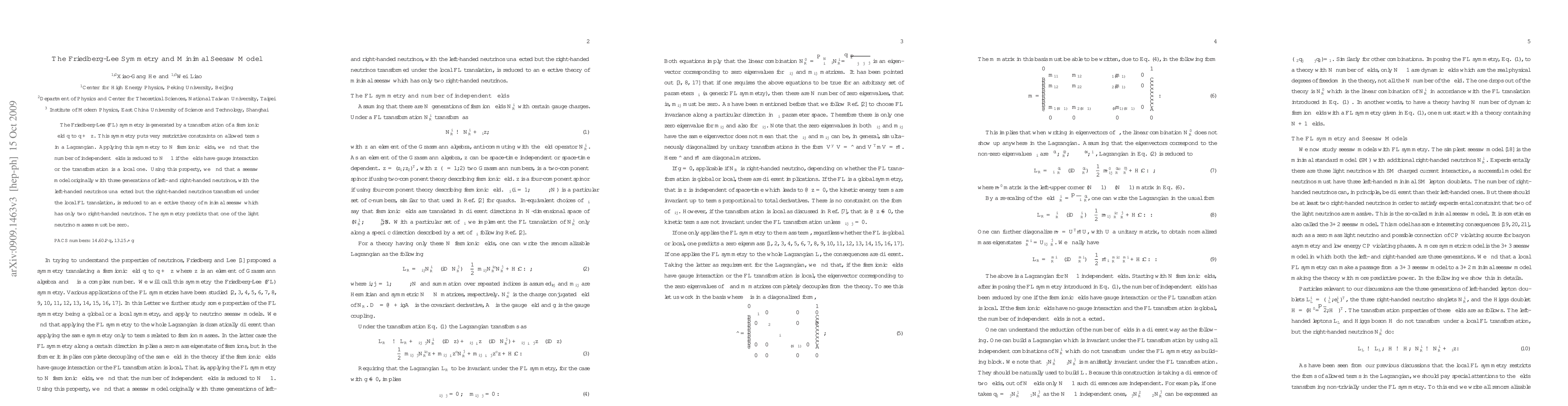 The Friedberg-Lee symmetry reduces the number of independent fermionic fields in a Lagrangian, leading to a minimal seesaw model with only two right-handed neutrinos instead of three, and predicts one of the light neutrino masses to be zero.