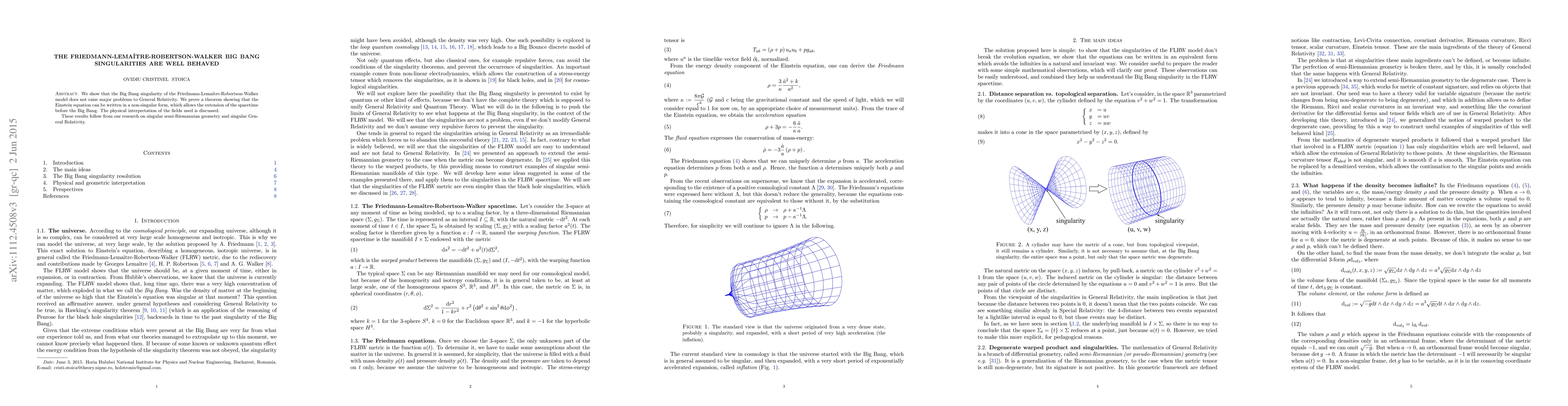 This paper demonstrates that the Big Bang singularity in the Friedmann-Lemaitre-Robertson-Walker model does not pose significant issues for General Relativity, proving a theorem that allows the Einstein equation to be expressed in a non-singular form, thus extending spacetime before the Big Bang. The study builds on research in singular semi-Riemannian geometry and singular General Relativity.