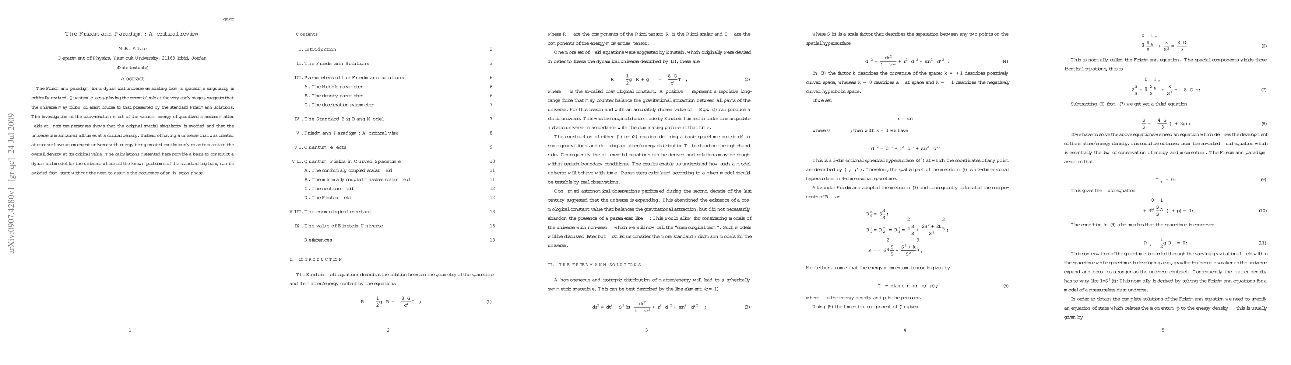 This paper critically examines the Friedmann paradigm, suggesting that quantum effects and vacuum energy back-reaction at early stages lead to an emergent universe model, avoiding spatial singularities and the need for an inflationary phase. The model maintains a critical density without a singular creation event.