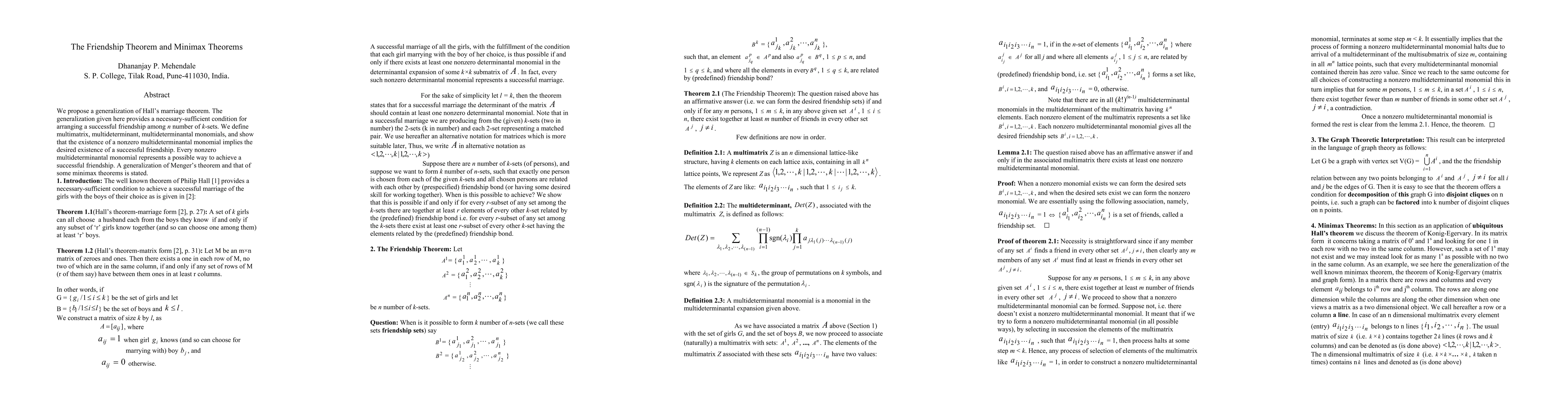 We propose a generalization of Halls marriage theorem. The generalization given here provides a necessary sufficient condition for arranging a successful friendship among n number of k sets. We define multimatrix, multideterminant, multideterminantal monomials, and show that the existence of a nonzero multideterminantal monomial implies the desired existence of a successful friendship. Every nonzero multideterminantal monomial represents a possible way to achieve a successful friendship. A generalization of Mengers theorem and that of some minimax theorems is stated.