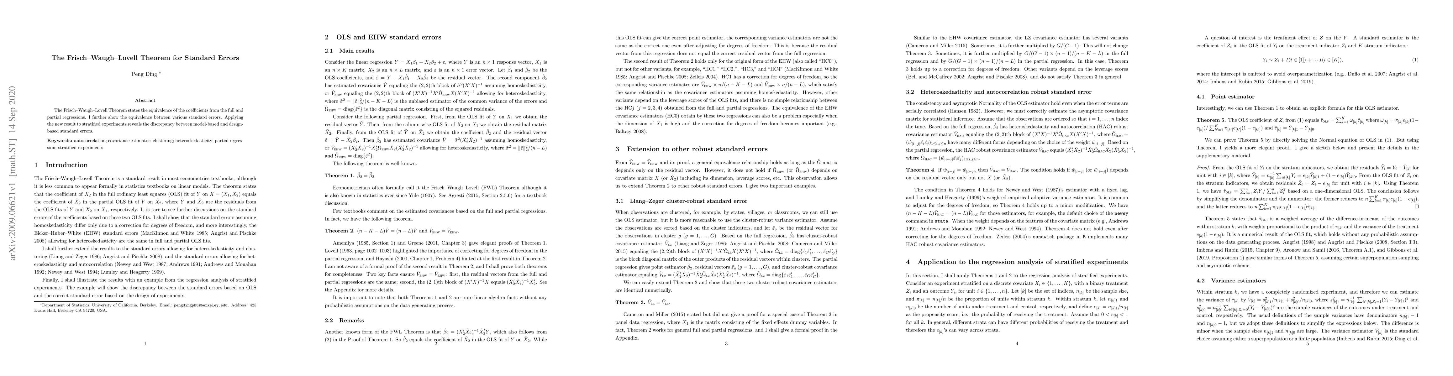 The paper extends the Frisch-Waugh-Lovell Theorem to show equivalence between model-based and design-based standard errors in stratified experiments, highlighting a discrepancy between these two approaches.