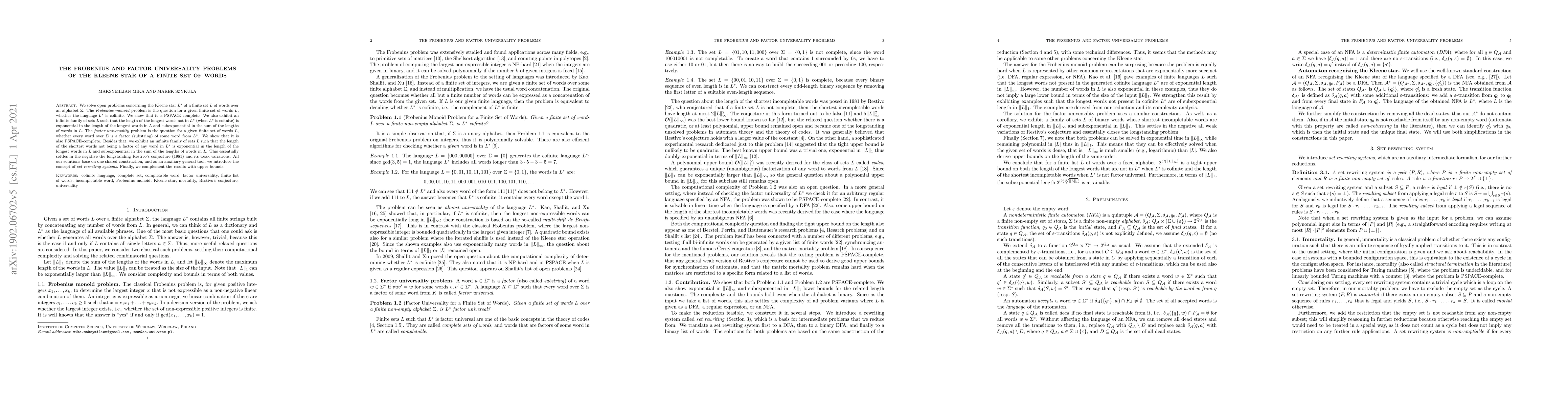 We solve open problems concerning the Kleene star $L^*$ of a finite set $L$ of words over an alphabet $\Sigma$. The \emph{Frobenius monoid} problem is the question for a given finite set of words $L$, whether the language $L^*$ is cofinite. We show that it is PSPACE-complete. We also exhibit an infinite family of sets $L$ such that the length of the longest words not in $L^*$ (when $L^*$ is cofinite) is exponential in the length of the longest words in $L$ and subexponential in the sum of the lengths of words in $L$. The \emph{factor universality} problem is the question for a given finite set of words $L$, whether every word over $\Sigma$ is a factor (substring) of some word from $L^*$. We show that it is also PSPACE-complete. Besides that, we exhibit an infinite family of sets $L$ such that the length of the shortest words not being a factor of any word in $L^*$ is exponential in the length of the longest words in $L$ and subexponential in the sum of the lengths of words in $L$. This essentially settles in the negative the longstanding Restivo's conjecture (1981) and its weak variations. All our solutions base on one shared construction, and as an auxiliary general tool, we introduce the concept of \emph{set rewriting systems}. Finally, we complement the results with upper bounds.