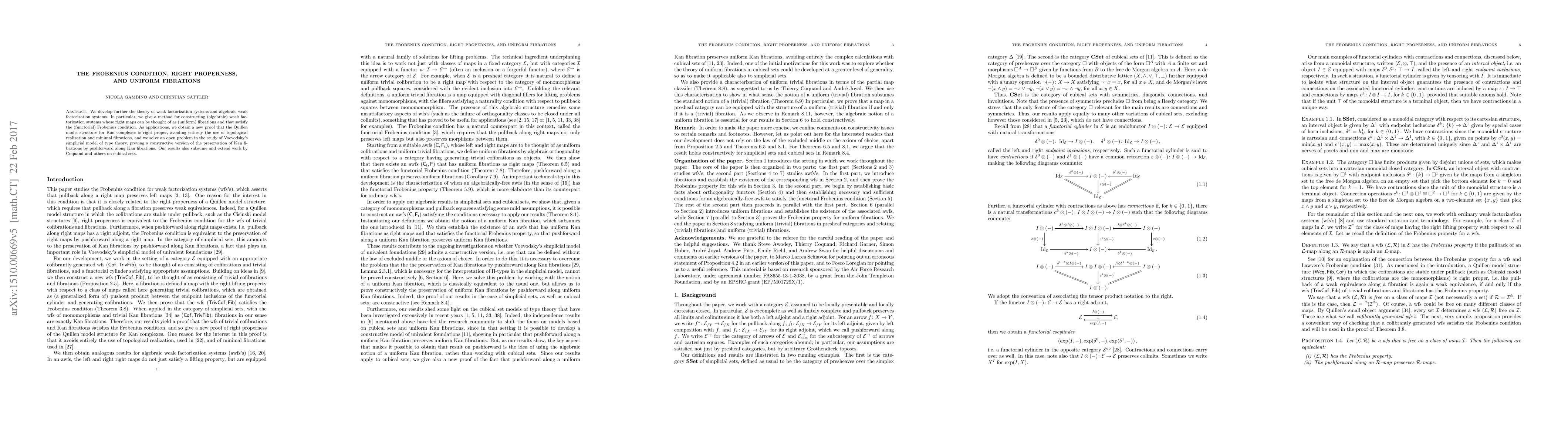 This paper develops methods for constructing algebraic weak factorization systems satisfying the Frobenius condition and uniform fibrations. It provides a new proof for the Quillen model structure's right properness and resolves an open problem regarding Kan fibrations in Voevodsky's simplicial model of type theory.