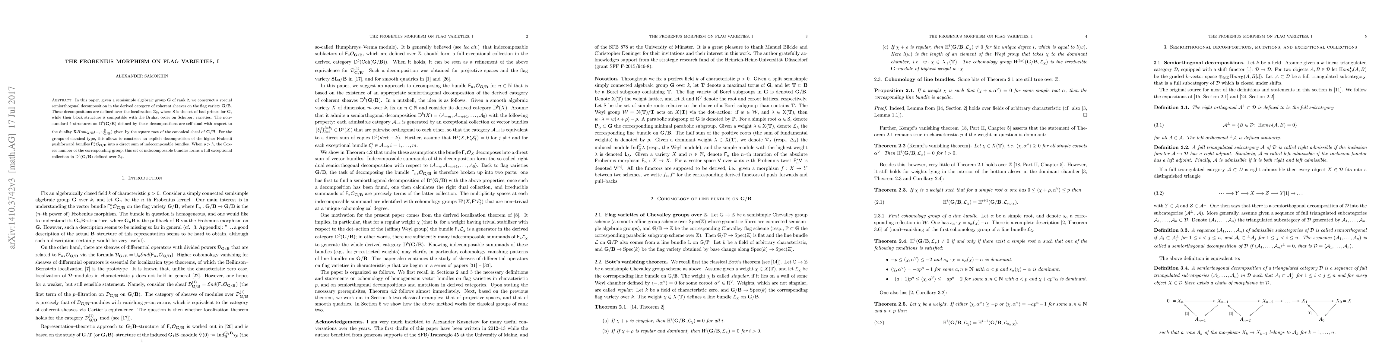 In this paper, given a semisimple algebraic group $\bf G$ of rank 2, we construct a special semiorthogonal decomposition in the derived category of coherent sheaves on the flag variety ${\bf G}/{\bf B}$. These decompositions are defined over the localization ${\mathbb Z}_{\rm S}$, where $\rm S$ is the set of bad primes for $\bf G$, while their block structure is compatible with the Bruhat order on Schubert varieties. The non-standard $t$-structures on ${\rm D}^b({\bf G}/{\bf B})$ defined by these decompositions are self-dual with respect to the duality ${\mathcal RHom}_{{\bf G}/{\bf B}}(-,\omega _{{\bf G}/{\bf B}}^{\frac{1}{2}})$ given by the square root of the canonical sheaf of ${\bf G}/{\bf B}$. For the groups of classical type, this allows to construct an explicit decomposition of the higher Frobenii pushforward bundles ${\sf F}^n_{\ast}{\mathcal O}_{{\bf G}/{\bf B}}$ into a direct sum of indecomposable bundles. When $p>h$, the Coxeer number of the corresponding group, this set of indecomposable bundles forms a full exceptional collection in ${\rm D}^b({\bf G}/{\bf B})$ defined over ${\mathbb Z}_{\rm S}$.
