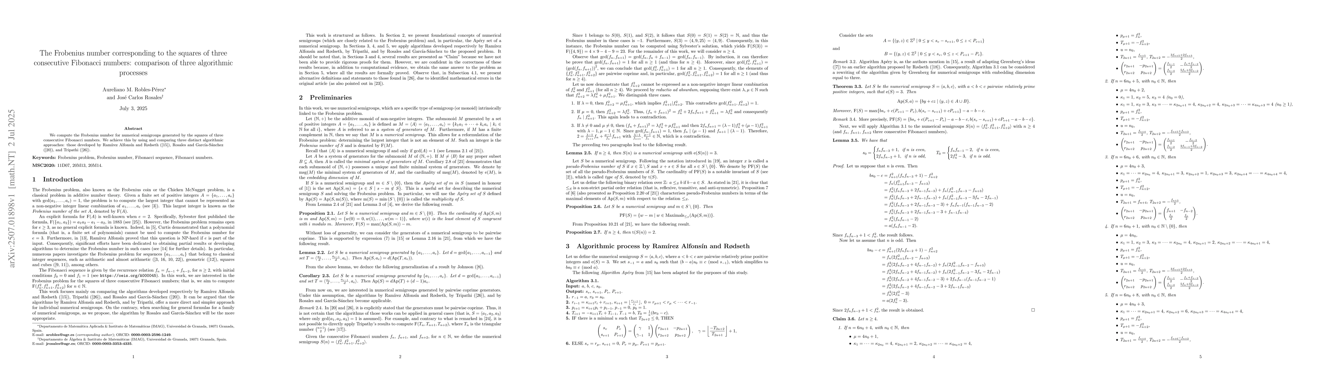 We compute the Frobenius number for numerical semigroups generated by the squares of three consecutive Fibonacci numbers. We achieve this by using and comparing three distinct algorithmic approaches: those developed by Ram\'irez Alfons\'in and R{\o}dseth ([15]), Rosales and Garc\'ia-S\'anchez ([20]), and Tripathi ([26]).