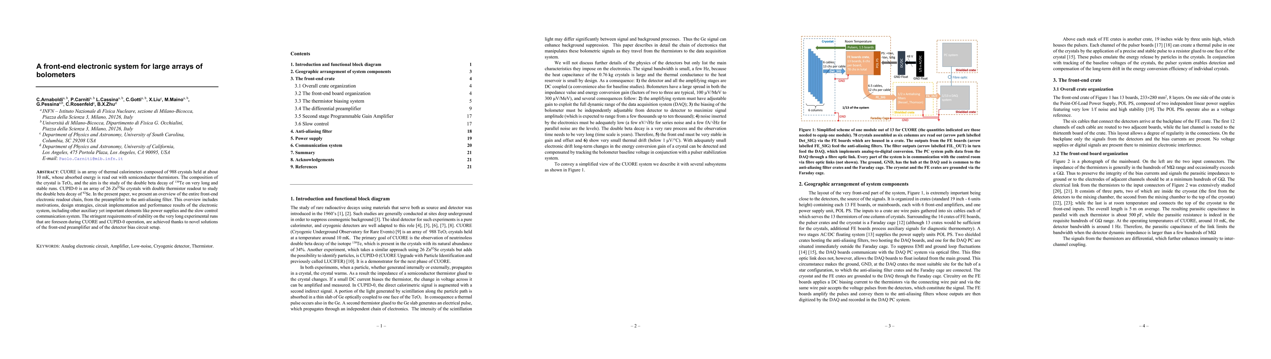 The CUORE experiment's front-end electronics system has been developed to achieve long-term stability in reading out thermal calorimeter signals with semiconductor thermistors. Novel solutions for preamplifiers and detector bias circuits enable the stringent requirements of the experiments.