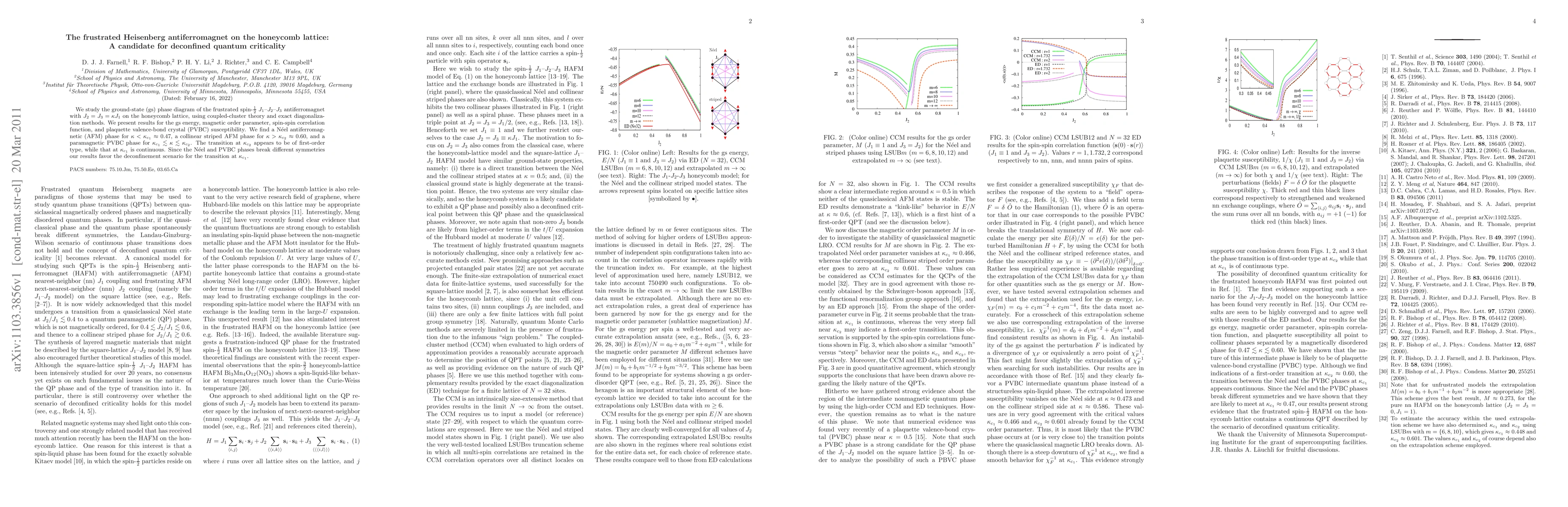 We study the ground-state (gs) phase diagram of the frustrated spin-1/2 $J_{1}$-$J_{2}$-$J_{3}$ antiferromagnet with $J_{2} = J_{3} =\kappa J_1$ on the honeycomb lattice, using coupled-cluster theory and exact diagonalization methods. We present results for the gs energy, magnetic order parameter, spin-spin correlation function, and plaquette valence-bond crystal (PVBC) susceptibility. We find a N\'eel antiferromagnetic (AFM) phase for $\kappa < \kappa_{c_{1}} \approx 0.47$, a collinear striped AFM phase for $\kappa > \kappa_{c_{2}} \approx 0.60$, and a paramagnetic PVBC phase for $\kappa_{c_{1}} \lesssim \kappa \lesssim \kappa_{c_{2}}$. The transition at $\kappa_{c_{2}}$ appears to be of first-order type, while that at $\kappa_{c_{1}}$ is continuous. Since the N\'eel and PVBC phases break different symmetries our results favor the deconfinement scenario for the transition at $\kappa_{c_{1}}$.