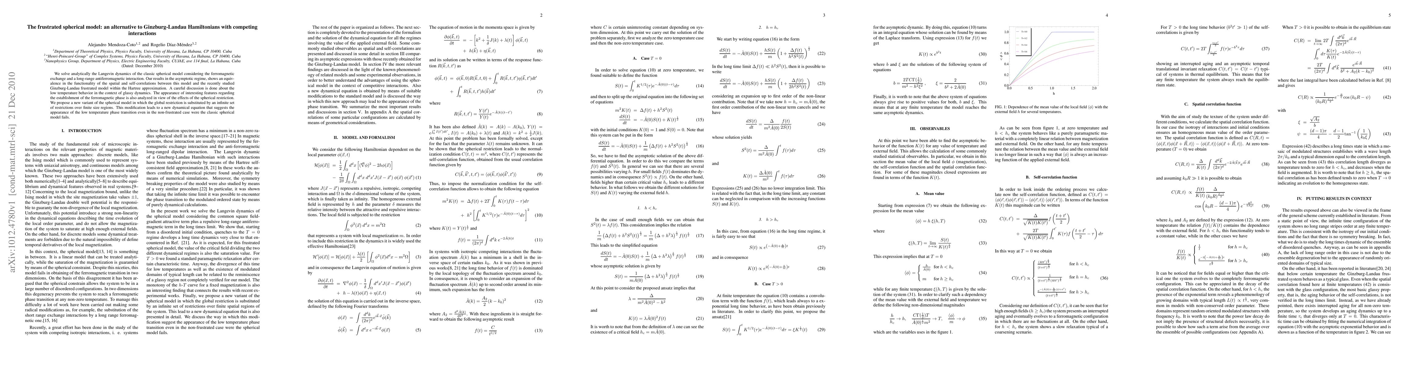 We solve analytically the Langevin dynamics of the classic spherical model considering the ferromagnetic exchange and a long-range antiferromagnetic interaction. Our results in the asymptotic regime, shows an equivalence in the functionality of the spatial and self-correlations between this model and the recently studied Ginzburg-Landau frustrated model within the Hartree approximation. A careful discussion is done about the low temperature behavior in the context of glassy dynamics. The appearance of interesting features regarding the establishment of the ferromagnetic phase is also analyzed in view of the effects of the spherical restriction. We propose a new variant of the spherical model in which the global restriction is substituted by an infinite set of restrictions over finite size regions. This modification leads to a new dynamical equation that suggests the appearance of the low temperature phase transition even in the non-frustrated case were the classic spherical model fails.