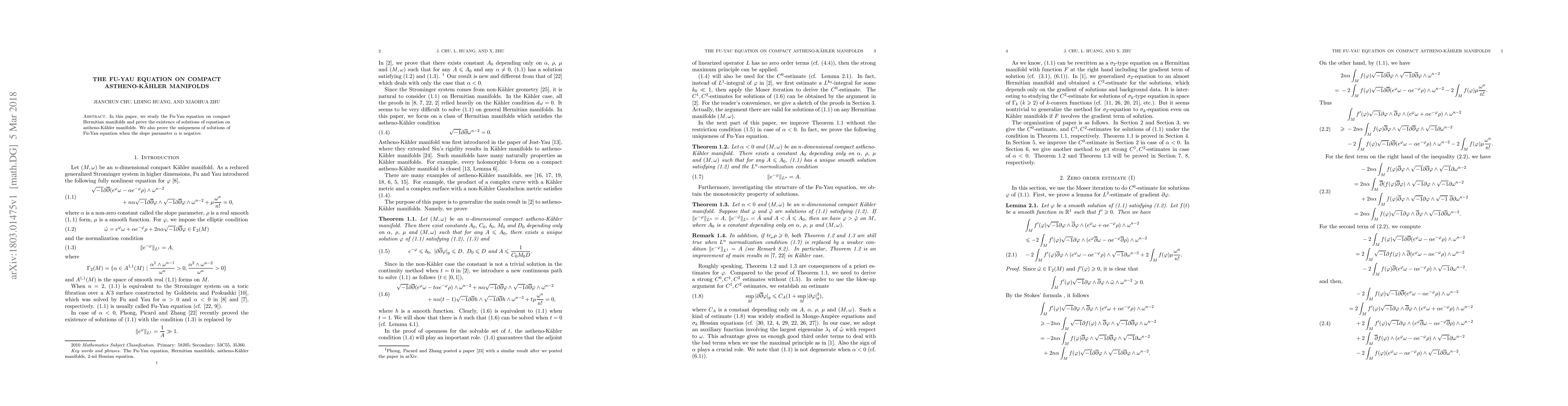 In this paper, we study the Fu-Yau equation on compact Hermitian manifolds and prove the existence of solutions of equation on astheno-K\"ahler manifolds. We also prove the uniqueness of solutions of Fu-Yau equation when the slope parameter $\alpha$ is negative.
