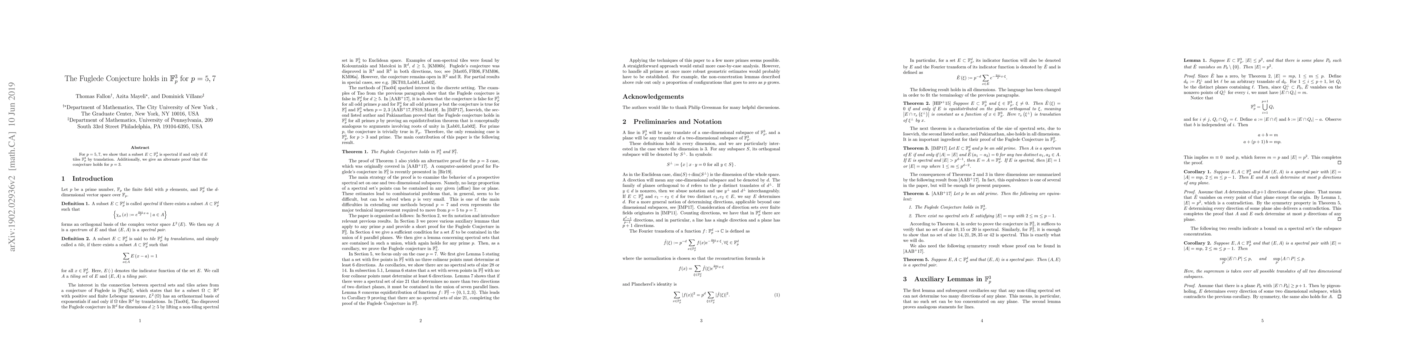 For p=5,7, we show that a subset \(E \subset \F_p^3\) is spectral if and only if E tiles \(\F_p^3\) by translation. Additionally, we give an alternate proof that the conjecture holds for p=3.
