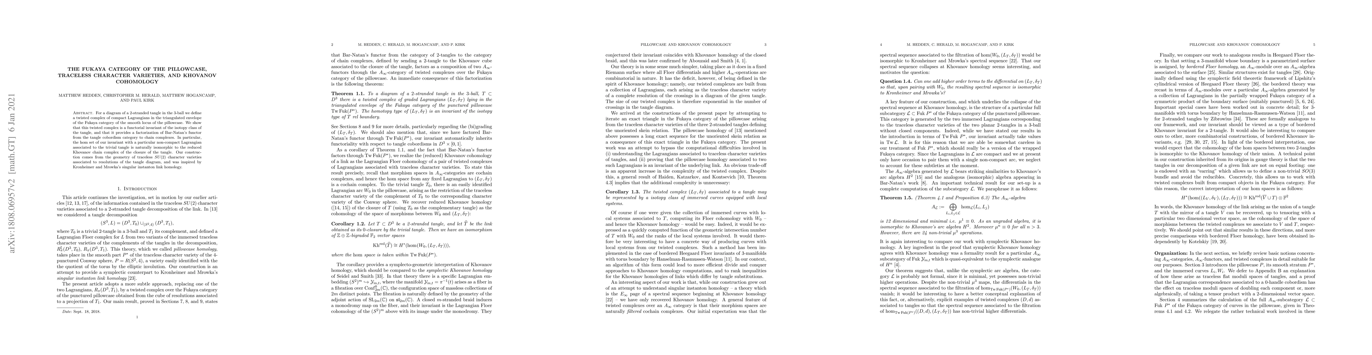This paper defines a twisted complex of Lagrangians in the Fukaya category of the pillowcase, demonstrating it as a functorial invariant for 2-stranded tangles. It also shows this complex factors Bar-Natan's functor and links it to the reduced Khovanov chain complex, inspired by character varieties and singular instanton link homology.