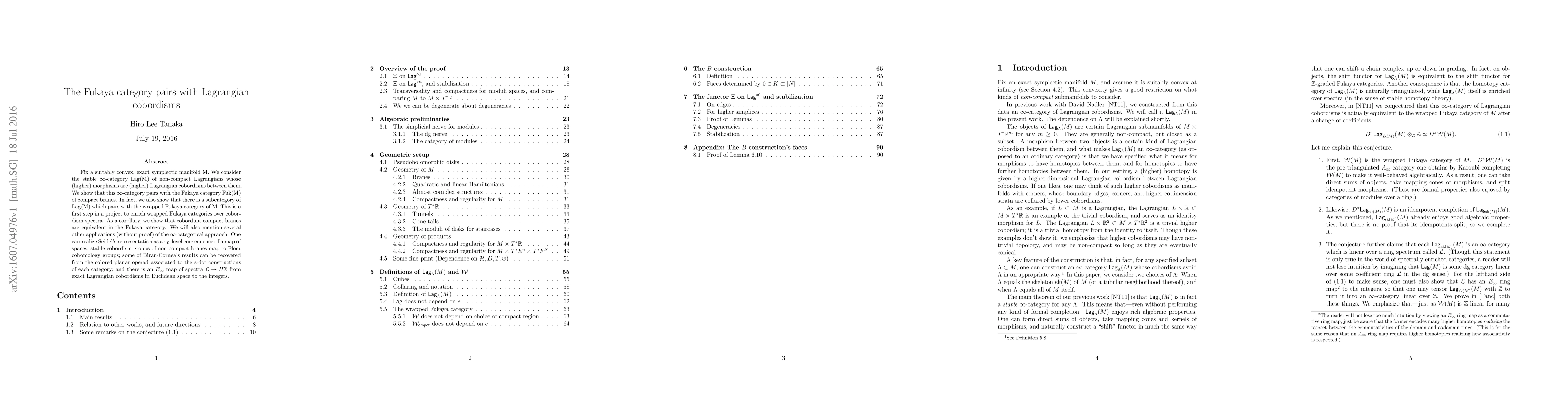 This paper establishes a pairing between the stable oo-category of non-compact Lagrangians and the Fukaya category of compact branes in a convex, exact symplectic manifold, demonstrating equivalence for cobordant compact branes. Additionally, it introduces applications such as realizing Seidel's representation and mapping stable cobordism groups to Floer cohomology groups.