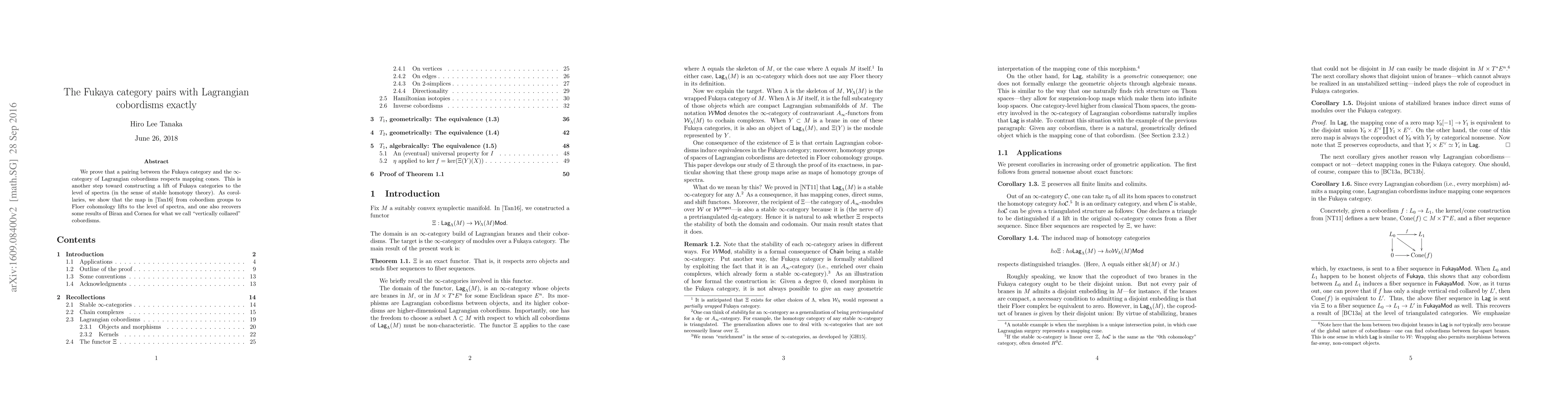 The paper demonstrates that the Fukaya category pairs with the ∞-category of Lagrangian cobordisms in a way that respects mapping cones, advancing the construction of a lift to spectra. This also extends previous results linking cobordism groups to Floer cohomology and recovers certain findings for "vertically collared" cobordisms.