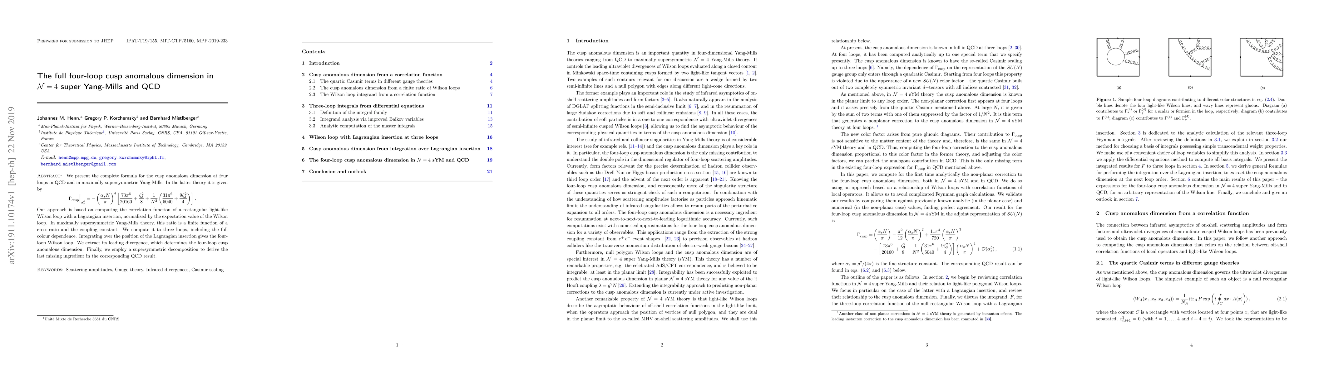 We present the complete formula for the cusp anomalous dimension at four loops in QCD and in maximally supersymmetric Yang-Mills. In the latter theory it is given by \begin{equation} {\Gamma}^{\rm}_{\rm cusp}\Big|_{\alpha_s^4} = -\left( \frac{\alpha_s N}{\pi}\right)^4 \left[ \frac{73 \pi^6}{20160} + \frac{ \zeta_{3}^2}{8} + \frac{1}{N^2} \left( \frac{31\pi^6}{5040} + \frac{9 \zeta_3^2}{4} \right) \right] \,.\nonumber \end{equation} Our approach is based on computing the correlation function of a rectangular light-like Wilson loop with a Lagrangian insertion, normalized by the expectation value of the Wilson loop. In maximally supersymmetric Yang-Mills theory, this ratio is a finite function of a cross-ratio and the coupling constant. We compute it to three loops, including the full colour dependence. Integrating over the position of the Lagrangian insertion gives the four-loop Wilson loop. We extract its leading divergence, which determines the four-loop cusp anomalous dimension. Finally, we employ a supersymmetric decomposition to derive the last missing ingredient in the corresponding QCD result.