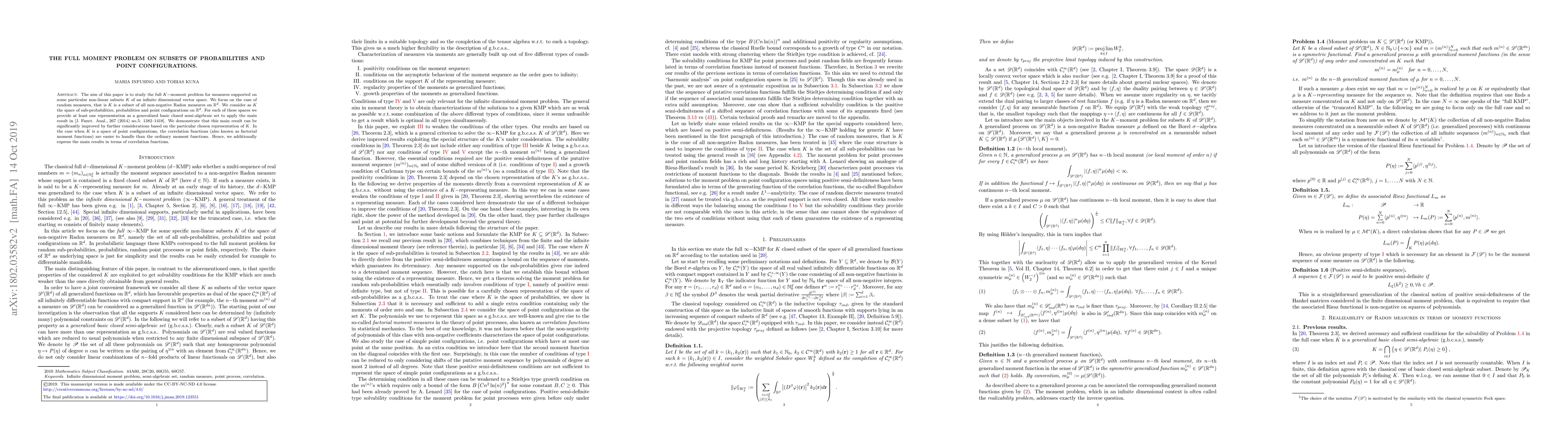 This paper investigates the full $K$-moment problem for measures on specific non-linear subsets $K$ of an infinite-dimensional vector space, focusing on sub-probabilities, probabilities, and point configurations on $\mathbb{R}^d$. It provides representations of these spaces as generalized basic closed semi-algebraic sets, improving upon previous results by leveraging specific representations and expressing findings in terms of correlation functions.