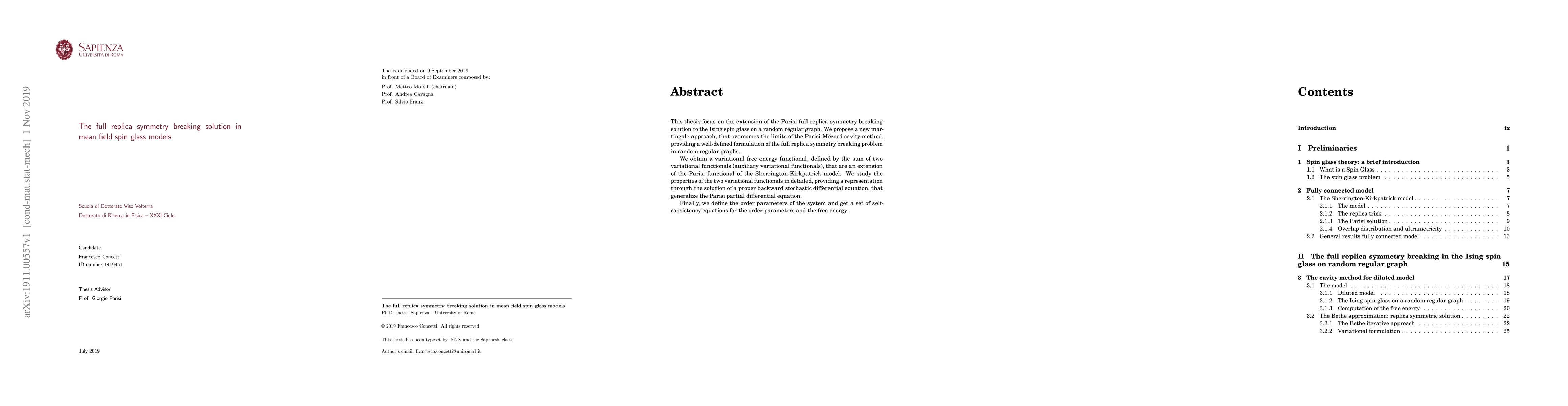 This thesis focus on the extension of the Parisi full replica symmetry breaking solution to the Ising spin glass on a random regular graph. We propose a new martingale approach, that overcomes the limits of the Parisi-M\'ezard cavity method, providing a well-defined formulation of the full replica symmetry breaking problem in random regular graphs. We obtain a variational free energy functional, defined by the sum of two variational functionals (auxiliary variational functionals), that are an extension of the Parisi functional of the Sherrington-Kirkpatrick model. We study the properties of the two variational functionals in detailed, providing representation through the solution of a proper backward stochastic differential equation, that generalize the Parisi partial differential equation. Finally, we define the order parameters of the system and get a set of self-consistency equations for the order parameters and free energy.