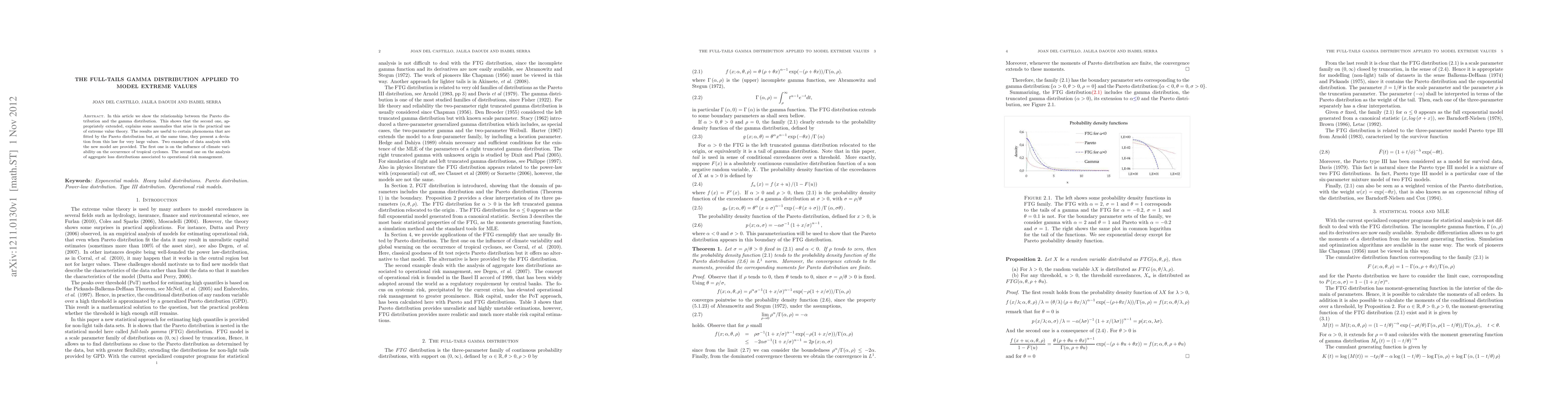In this article we show the relationship between the Pareto distribution and the gamma distribution. This shows that the second one, appropriately extended, explains some anomalies that arise in the practical use of extreme value theory. The results are useful to certain phenomena that are fitted by the Pareto distribution but, at the same time, they present a deviation from this law for very large values. Two examples of data analysis with the new model are provided. The first one is on the influence of climate variability on the occurrence of tropical cyclones. The second one on the analysis of aggregate loss distributions associated to operational risk management.