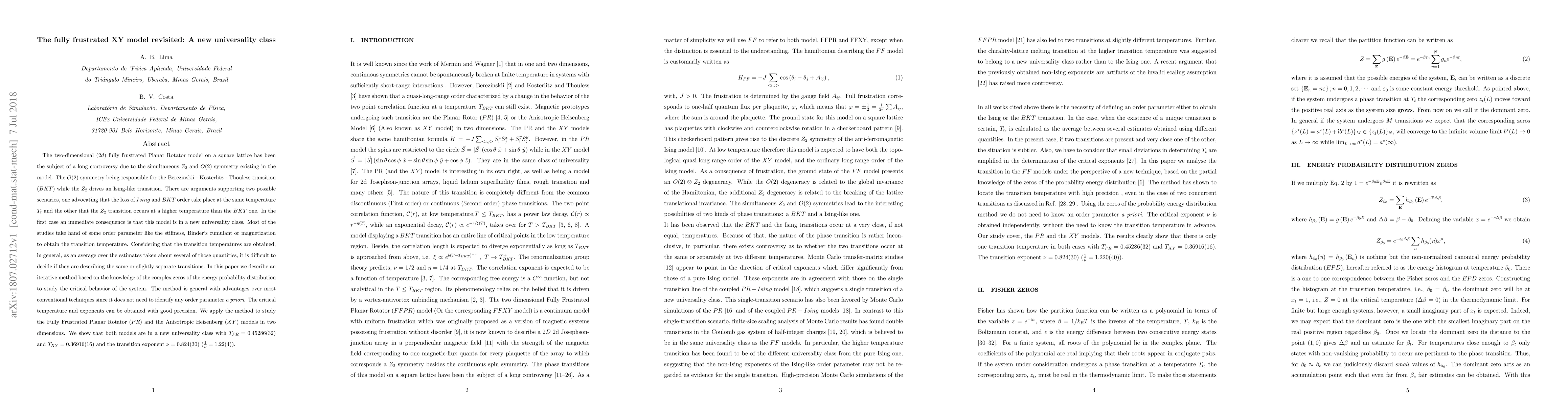 The two-dimensional ($2d$) fully frustrated Planar Rotator model on a square lattice has been the subject of a long controversy due to the simultaneous $Z_2$ and $O(2)$ symmetry existing in the model. The $O(2)$ symmetry being responsible for the Berezinskii - Kosterlitz - Thouless transition ($BKT$) while the $Z_2$ drives an Ising-like transition. There are arguments supporting two possible scenarios, one advocating that the loss of $Ising$ and $BKT$ order take place at the same temperature $T_{t}$ and the other that the $Z_2$ transition occurs at a higher temperature than the $BKT$ one. In the first case an immediate consequence is that this model is in a new universality class. Most of the studies take hand of some order parameter like the stiffness, Binder's cumulant or magnetization to obtain the transition temperature. Considering that the transition temperatures are obtained, in general, as an average over the estimates taken about several of those quantities, it is difficult to decide if they are describing the same or slightly separate transitions. In this paper we describe an iterative method based on the knowledge of the complex zeros of the energy probability distribution to study the critical behavior of the system. The method is general with advantages over most conventional techniques since it does not need to identify any order parameter \emph{a priori}. The critical temperature and exponents can be obtained with good precision. We apply the method to study the Fully Frustrated Planar Rotator ($PR$) and the Anisotropic Heisenberg ($XY$) models in two dimensions. We show that both models are in a new universality class with $T_{PR}=0.45286(32)$ and $T_{XY}=0.36916(16)$ and the transition exponent $\nu=0.824(30)$ ($\frac{1}{\nu}=1.22(4)$).