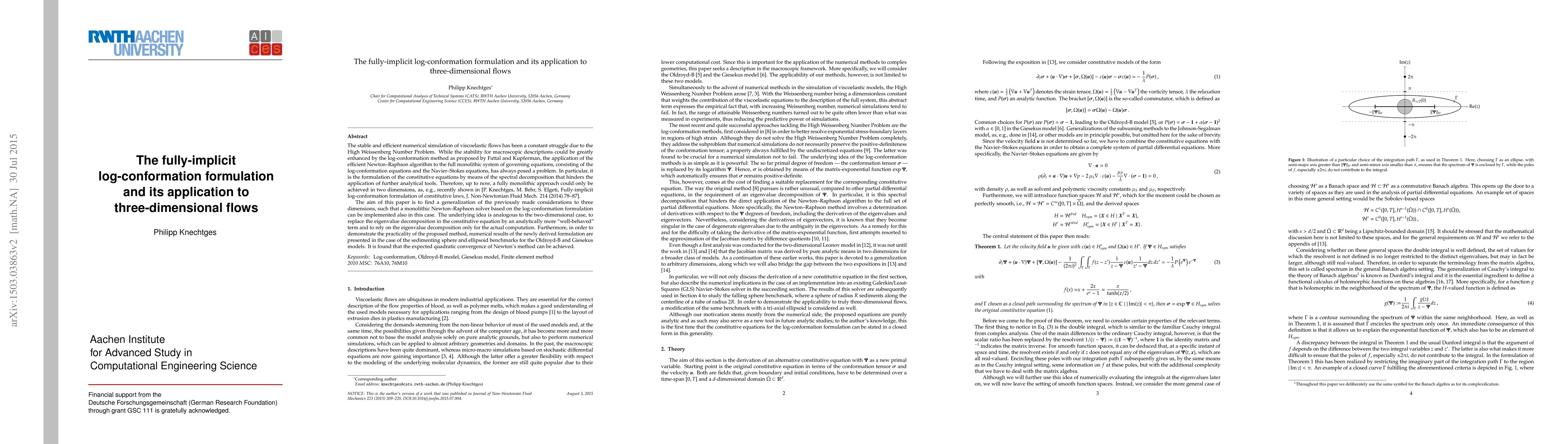 This paper proposes a fully-implicit log-conformation formulation for three-dimensional viscoelastic flows, addressing the High Weissenberg Number Problem. It generalizes the two-dimensional approach by replacing eigenvalue decomposition with a more analytically tractable term, enabling a monolithic Newton-Raphson solver. Numerical results for sedimenting spheres and ellipsoids show expected quadratic convergence.