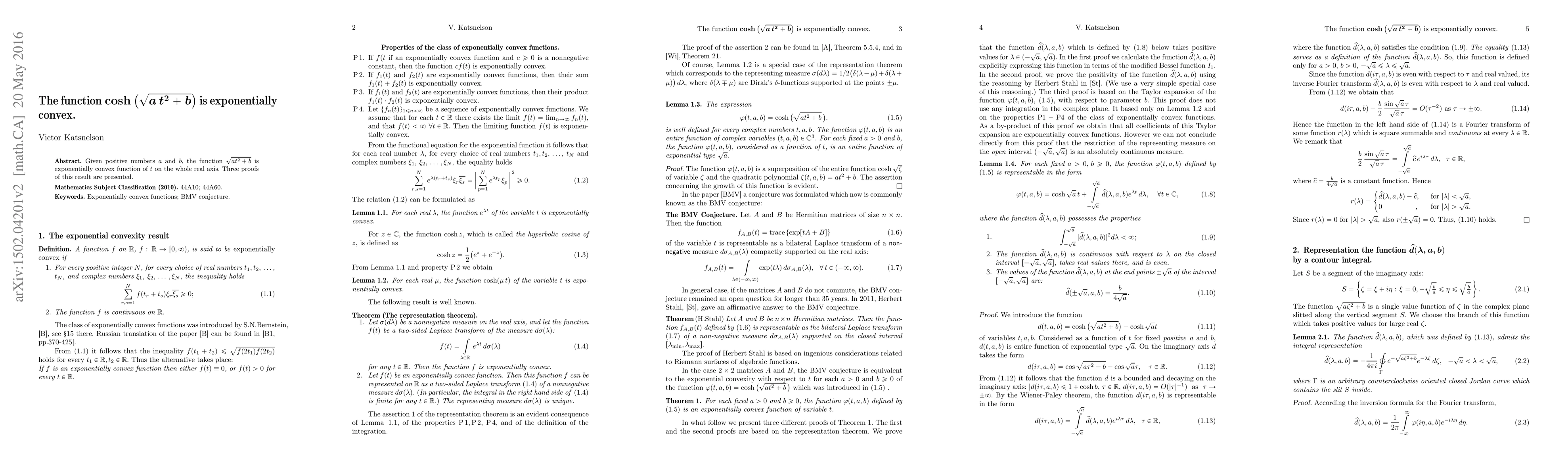 Given positive numbers $a$ and $b$, the function $\sqrt{at^2+b}$ is exponentially convex function of $t$ on the whole real axis. Three proofs of this result are presented.