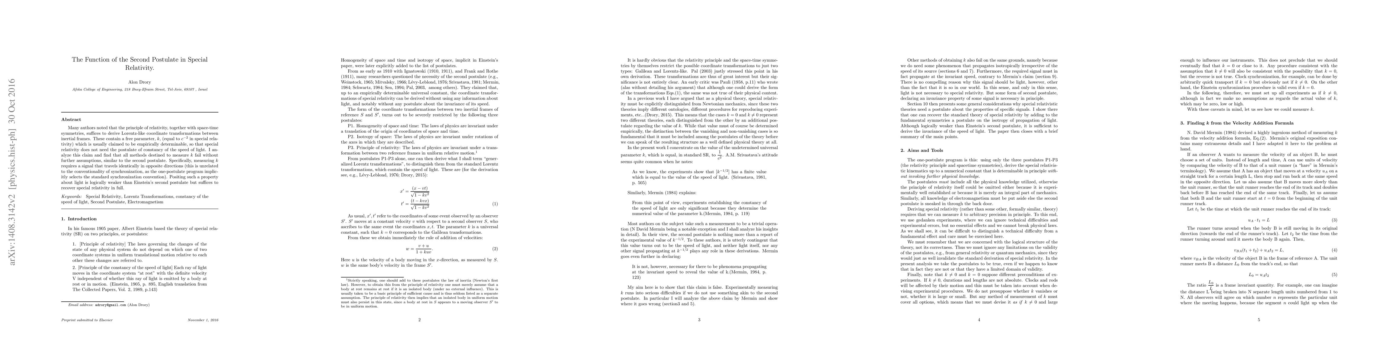 This paper argues that the principle of relativity and space-time symmetries alone can derive Lorentz transformations, but measuring the constant $k$ requires assumptions akin to the second postulate of special relativity, thus highlighting the necessity of the postulate of light's constant speed.