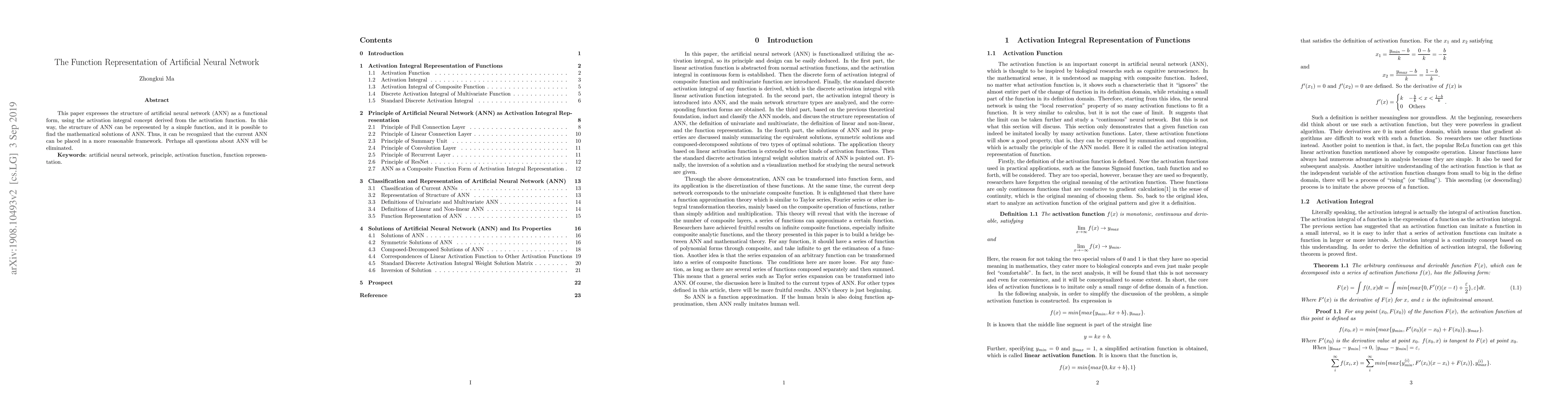 This paper expresses the structure of artificial neural network (ANN) as a functional form, using the activation integral concept derived from the activation function. In this way, the structure of ANN can be represented by a simple function, and it is possible to find the mathematical solutions of ANN. Thus, it can be recognized that the current ANN can be placed in a more reasonable framework. Perhaps all questions about ANN will be eliminated.