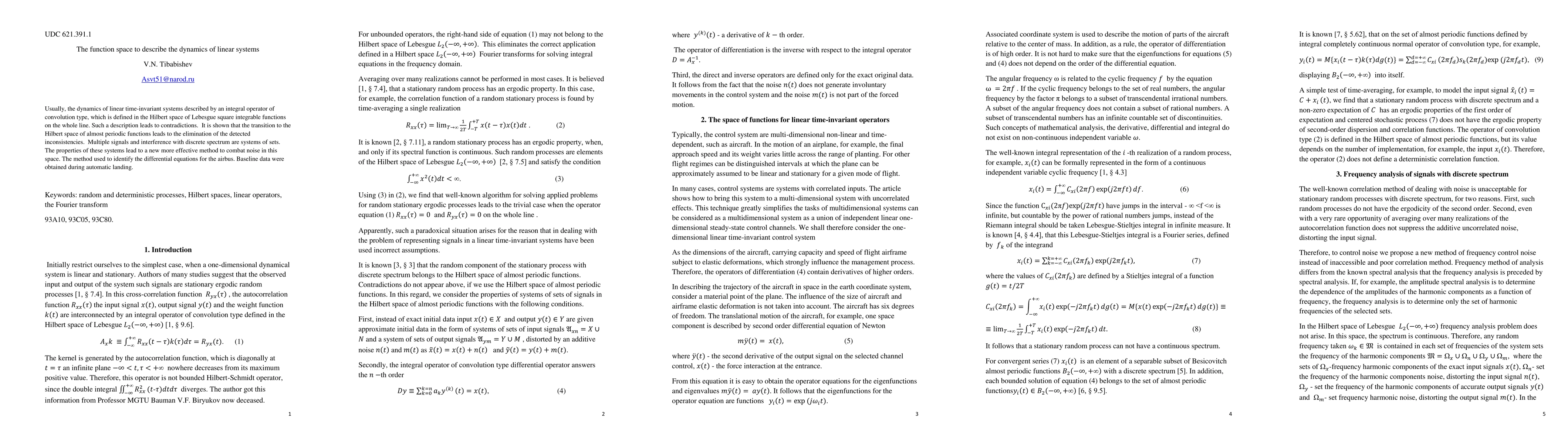 Usually, the dynamics of linear time-invariant systems described by an integral operator of convolution type, which is defined in the Hilbert space of Lebesgue square integrable functions on the whole line. Such a description leads to contradictions. It is shown that the transition to the Hilbert space of almost periodic functions leads to the elimination of the detected inconsistencies. Multiple signals and interference with discrete spectrum are systems of sets. The properties of these systems lead to a new more effective method to combat noise in this space. The method used to identify the differential equations for the airbus. Baseline data were obtained during automatic landing.