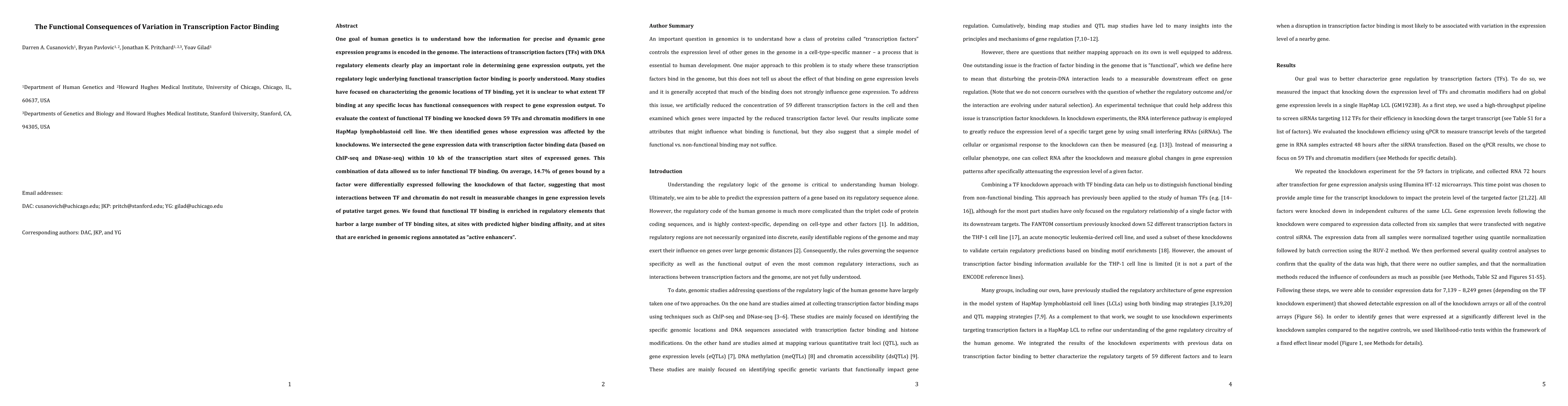 This study investigates the functional consequences of transcription factor binding by knocking down 59 TFs and chromatin modifiers in a lymphoblastoid cell line, finding that on average 14.7% of genes bound by a factor showed differential expression. Functional TF binding is most prevalent in regions with multiple TF binding sites, higher binding affinity, and active enhancers.
