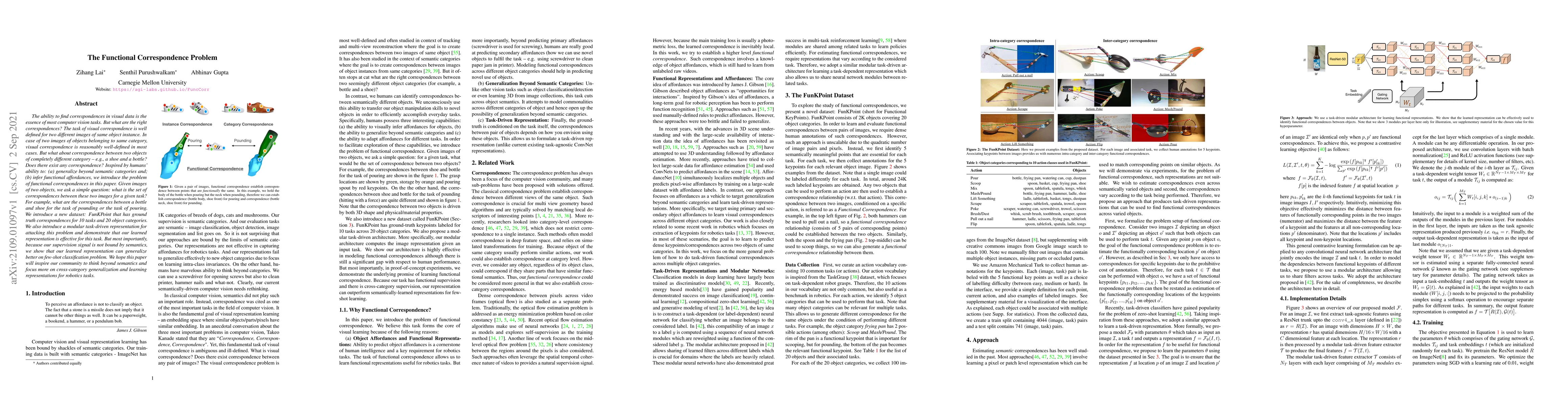 The ability to find correspondences in visual data is the essence of most computer vision tasks. But what are the right correspondences? The task of visual correspondence is well defined for two different images of same object instance. In case of two images of objects belonging to same category, visual correspondence is reasonably well-defined in most cases. But what about correspondence between two objects of completely different category -- e.g., a shoe and a bottle? Does there exist any correspondence? Inspired by humans' ability to: (a) generalize beyond semantic categories and; (b) infer functional affordances, we introduce the problem of functional correspondences in this paper. Given images of two objects, we ask a simple question: what is the set of correspondences between these two images for a given task? For example, what are the correspondences between a bottle and shoe for the task of pounding or the task of pouring. We introduce a new dataset: FunKPoint that has ground truth correspondences for 10 tasks and 20 object categories. We also introduce a modular task-driven representation for attacking this problem and demonstrate that our learned representation is effective for this task. But most importantly, because our supervision signal is not bound by semantics, we show that our learned representation can generalize better on few-shot classification problem. We hope this paper will inspire our community to think beyond semantics and focus more on cross-category generalization and learning representations for robotics tasks.