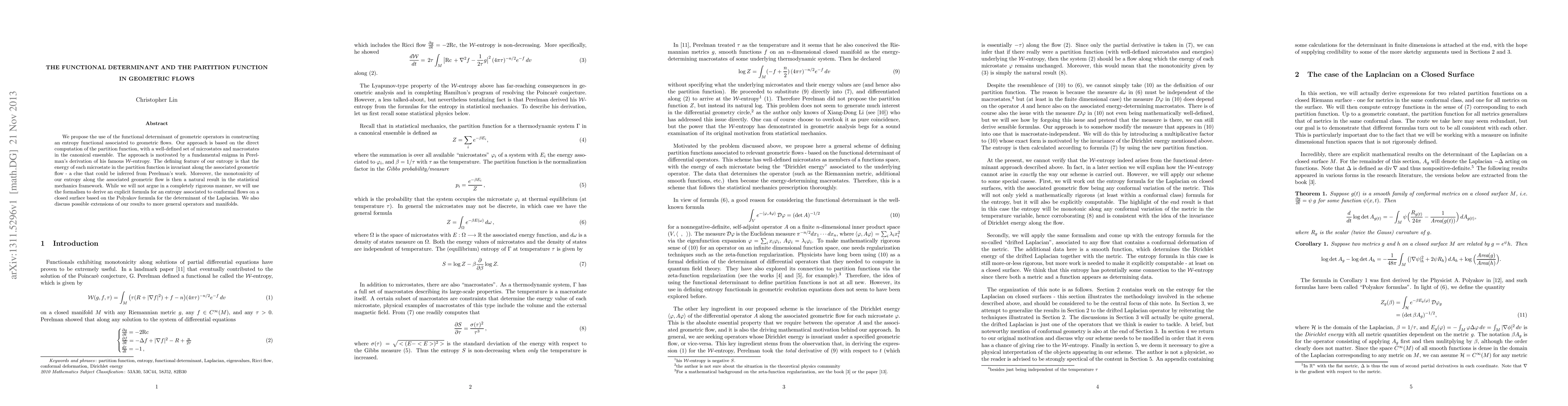 We propose the use of the functional determinant of geometric operators in constructing an entropy functional associated to geometric flows. Our approach is based on the direct computation of the partition function, with a well-defined set of microstates and macrostates in the canonical ensemble. The approach is motivated by a fundamental enigma in Perelman's derivation of his famous $\mathcal{W}$-entropy. The defining feature of our entropy is that the energy of each microstate in the partition function is invariant along the associated geometric flow - a clue that could be inferred from Perelman's work. Moreover, the monotonicity of our entropy along the associated geometric flow is then a natural result in the statistical mechanics framework. While we will not argue in a completely rigorous manner, we will use the formalism to derive an explicit formula for an entropy associated to conformal flows on a closed surface based on the Polyakov formula for the determinant of the Laplacian. We also discuss possible extensions of our results to more general operators and manifolds.