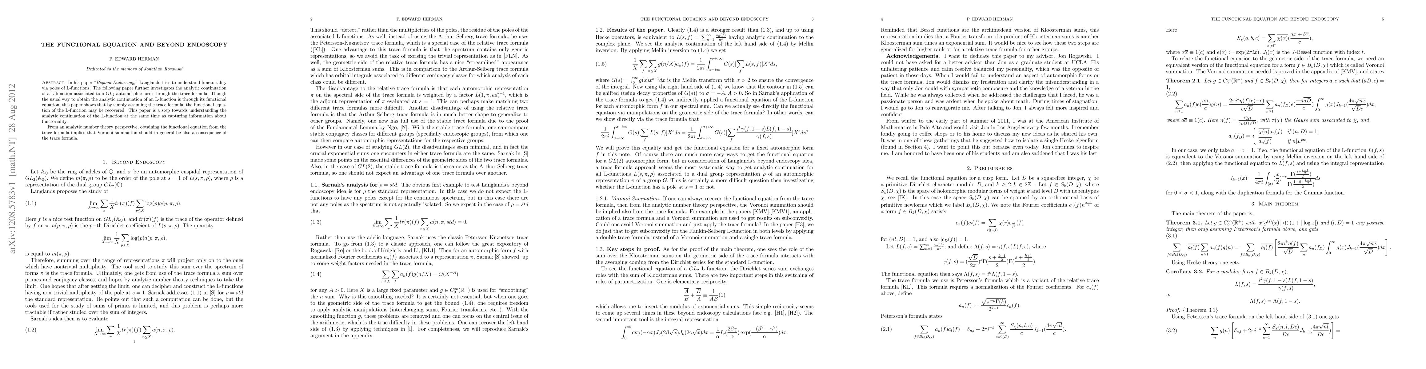 In his paper "Beyond Endoscopy," Langlands tries to understand functoriality via poles of L-functions. The following paper further investigates the analytic continuation of a L-function associated to a $GL_2$ automorphic form through the trace formula. Though the usual way to obtain the analytic continuation of an L-function is through its functional equation, this paper shows that by simply assuming the trace formula, the functional equation of the L-function may be recovered. This paper is a step towards understanding the analytic continuation of the L-function at the same time as capturing information about functoriality. From an analytic number theory perspective, obtaining the functional equation from the trace formula implies that Voronoi summation should in general be also a consequence of the trace formula.