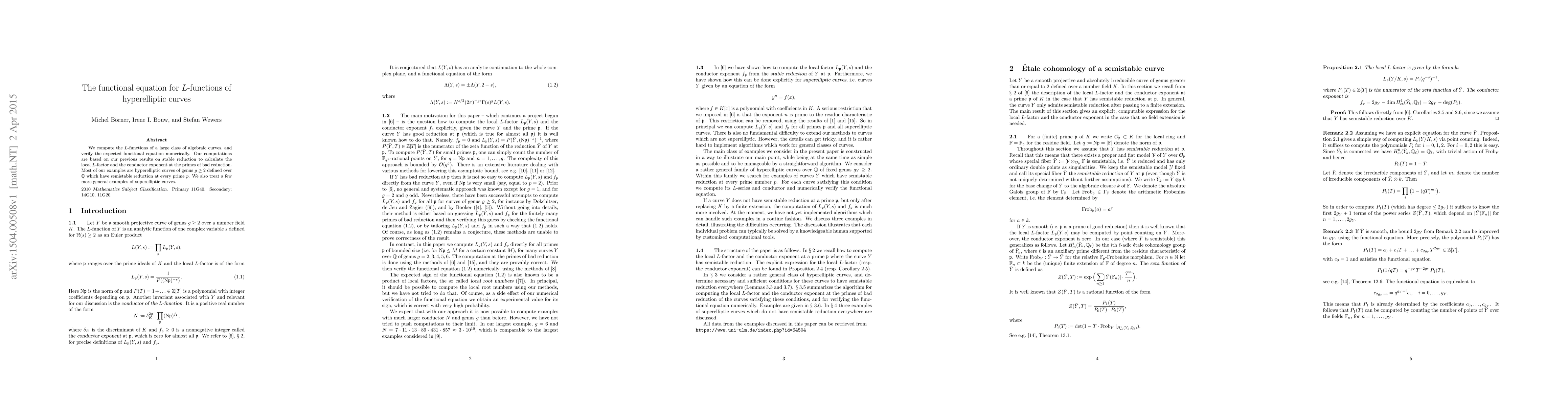 Researchers compute L-functions for a large class of hyperelliptic curves, verifying their functional equation numerically, using previous results on stable reduction to calculate local L-factors and conductor exponents.