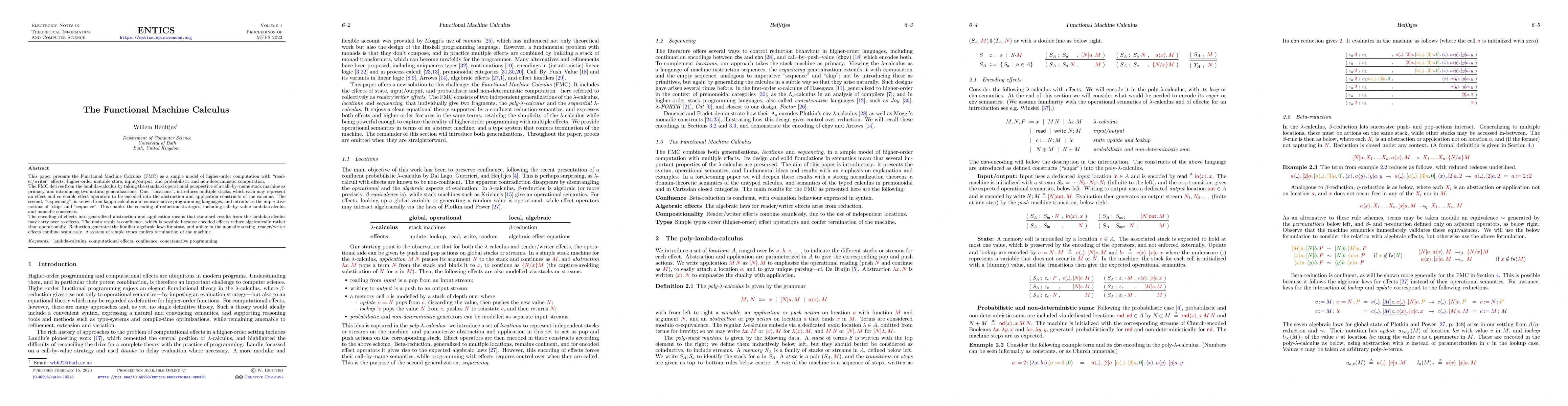 The Functional Machine Calculus (FMC) extends the lambda-calculus by incorporating "reader/writer" effects through multiple stacks and sequencing, enabling higher-order computation with input/output and probabilistic/non-deterministic behavior. The model achieves confluence and termination through algebraic reduction of effects.