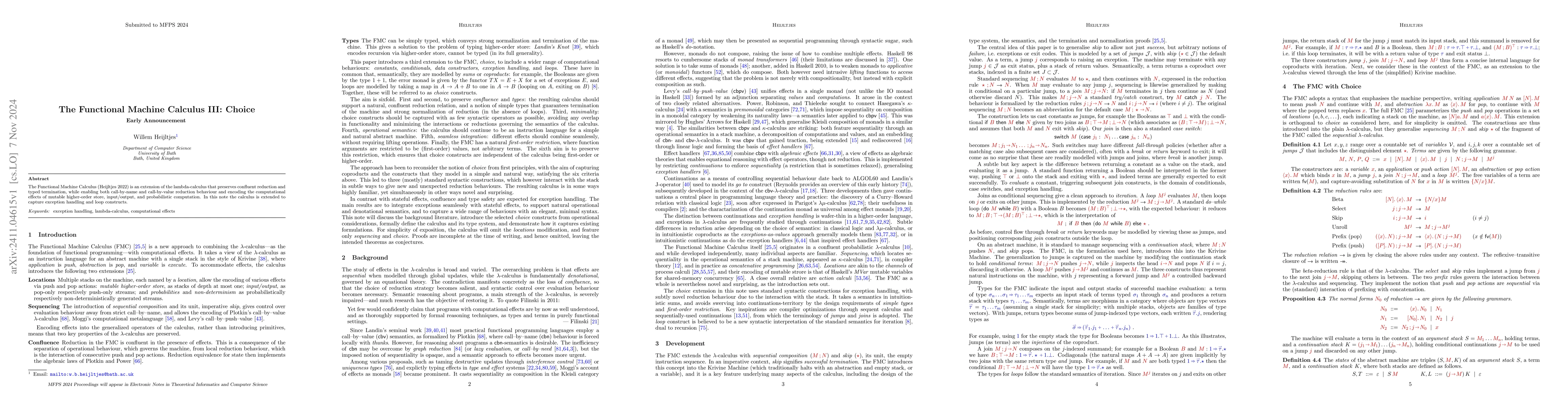 The Functional Machine Calculus III extends the lambda-calculus to incorporate exception handling and loop constructs while maintaining confluent reduction, typed termination, and support for both call-by-name and call-by-value behaviors. This update builds on previous work to encode computational effects such as mutable store, I/O, and probabilistic computation.