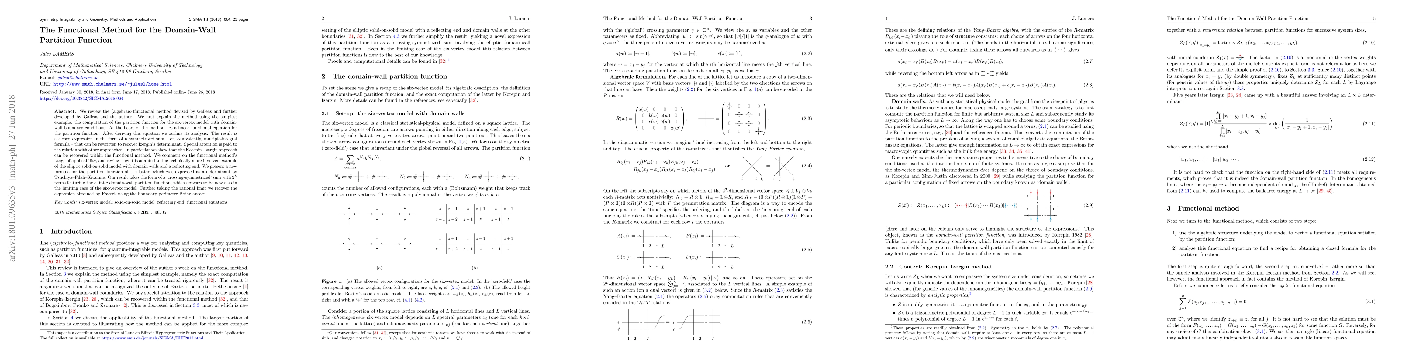 We review the (algebraic-)functional method devised by Galleas and further developed by Galleas and the author. We first explain the method using the simplest example: the computation of the partition function for the six-vertex model with domain-wall boundary conditions. At the heart of the method lies a linear functional equation for the partition function. After deriving this equation we outline its analysis. The result is a closed expression in the form of a symmetrized sum - or, equivalently, multiple-integral formula - that can be rewritten to recover Izergin's determinant. Special attention is paid to the relation with other approaches. In particular we show that the Korepin--Izergin approach can be recovered within the functional method. We comment on the functional method's range of applicability, and review how it is adapted to the technically more involved example of the elliptic solid-on-solid model with domain walls and a reflecting end. We present a new formula for the partition function of the latter, which was expressed as a determinant by Tsuchiya--Filali--Kitanine. Our result takes the form of a 'crossing-symmetrized' sum with $2^L$ terms featuring the elliptic domain-wall partition function, which appears to be new also in the limiting case of the six-vertex model. Further taking the rational limit we recover the expression obtained by Frassek using the boundary perimeter Bethe ansatz.