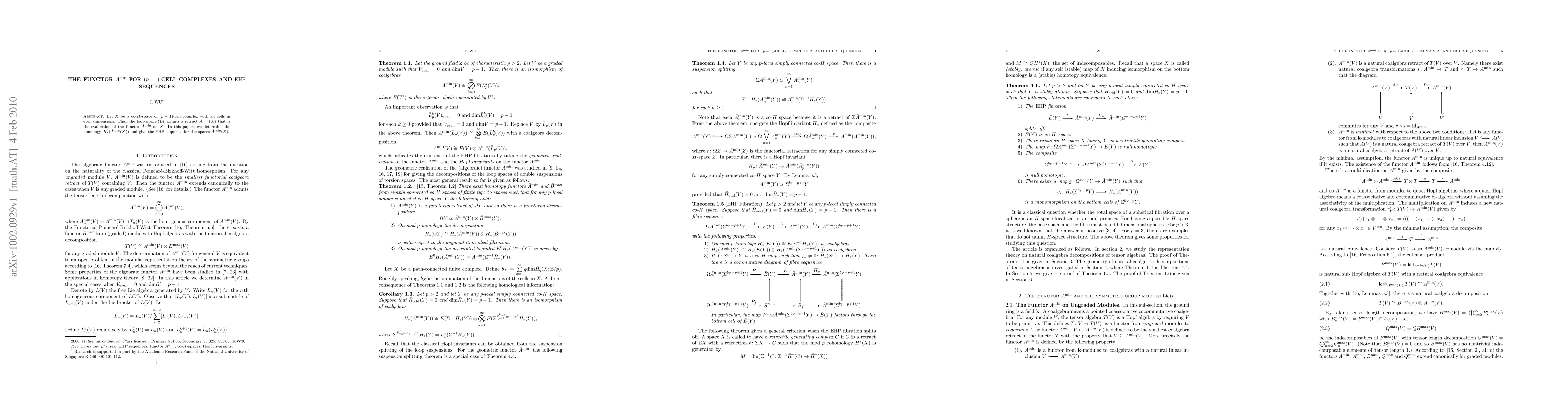 This paper investigates a functor $\bar A^{\min}$ for $(p-1)$-cell complexes, determining its homology and providing an $\EHP$ sequence for the associated spaces, revealing structural properties of the loop space $\Omega X$ of such co-$H$-spaces.