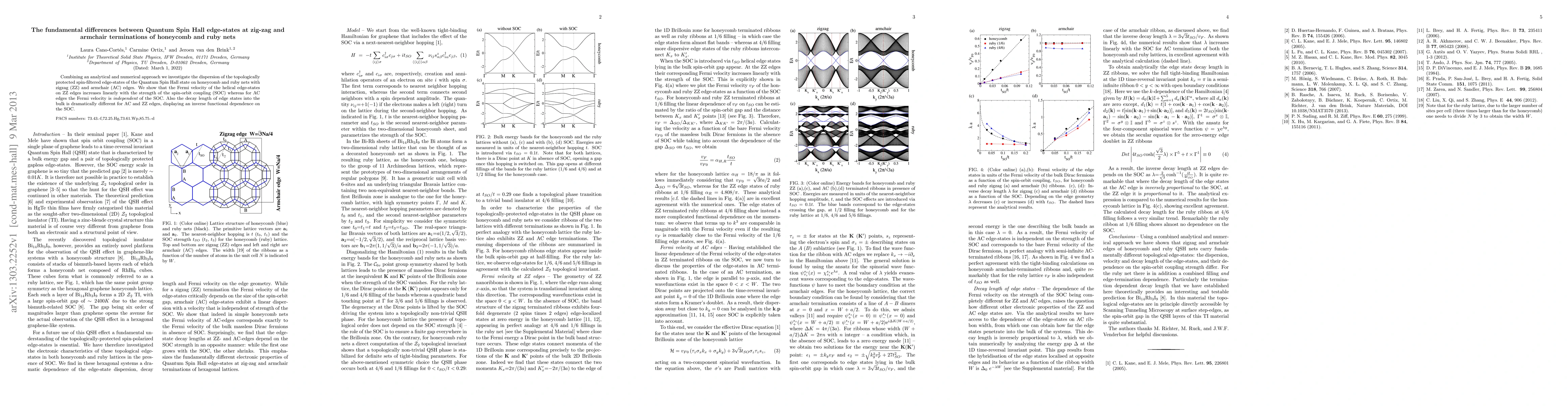 This research analyzes the Quantum Spin Hall edge-states in honeycomb and ruby nets with zigzag and armchair edges. It finds that the Fermi velocity of helical edge-states on zigzag edges increases with spin-orbit coupling, while it remains constant for armchair edges. The decay length of edge states into the bulk shows an inverse relationship with spin-orbit coupling, differing significantly between armchair and zigzag edges.