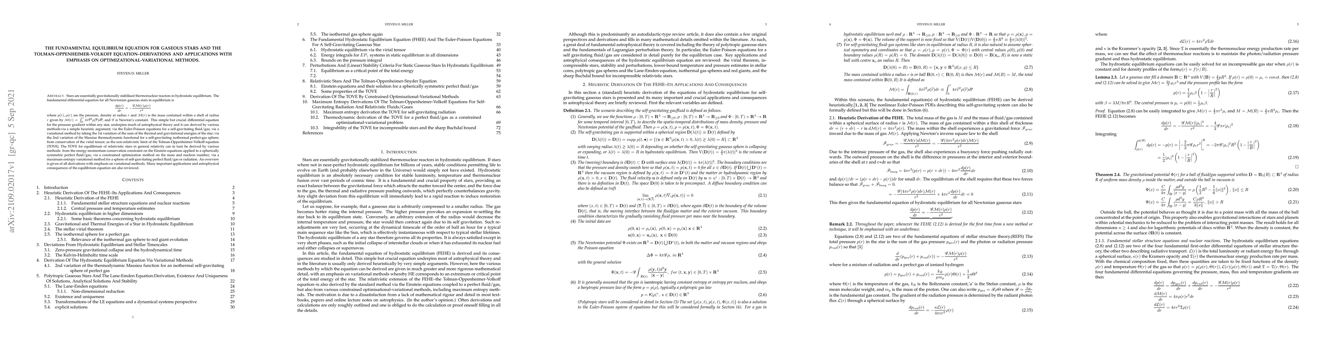 Stars are essentially gravitationally stabilised thermonuclear reactors in hydrostatic equilibrium. The fundamental differential equation for all Newtonian gaseous stars in equilibrium is \begin{align} \frac{dp(r)}{dr}=-\frac{\mathscr{G}\mathcal{M}(r)\rho(r)}{r^{2}}\nonumber \end{align} where $p(r),\rho(r)$ are the pressure, density at radius $r$ and $\mathcal{M}(r)$ is the mass contained within a shell of radius $r$ given by $\mathcal{M}(r)=\int_{0}^{r}4\pi \overline{r}^{2} \rho(\overline{r})d\overline{r}$, and $\mathscr{G}$ is Newton's constant. This simple but crucial differential equation for the pressure gradient within any star, underpins much of astrophysical theory and it can derived by various methods:via a simple heuristic argument; via the Euler-Poisson equations for a self-gravitating fluid/gas; via a variational method by taking the 1st variation of the sum of the thermal and gravitational energies of the star; via the 2nd variation of the Massiue thermodynamic functional for a self-gravitating isothermal perfect-gas sphere; from conservation of the virial tensor; as the non-relativistic limit of the Tolman-Oppenheimer-Volkoff equation (TOVE). The TOVE for equilibrium of relativistic stars in general relativity can in turn be derived by various methods: from the energy-momentum conservation constraint on the Einstein equations applied to a spherically symmetric perfect fluid/gas; via a constrained optimization method on the mass and nucleon number; via a maximum entropy variational method for a sphere of self-gravitating perfect fluid/gas or radiation. An overview is given of all derivations with emphasis on variational methods. Many important applications and astrophysical consequences of the Newtonian equilibrium equation are also reviewed.