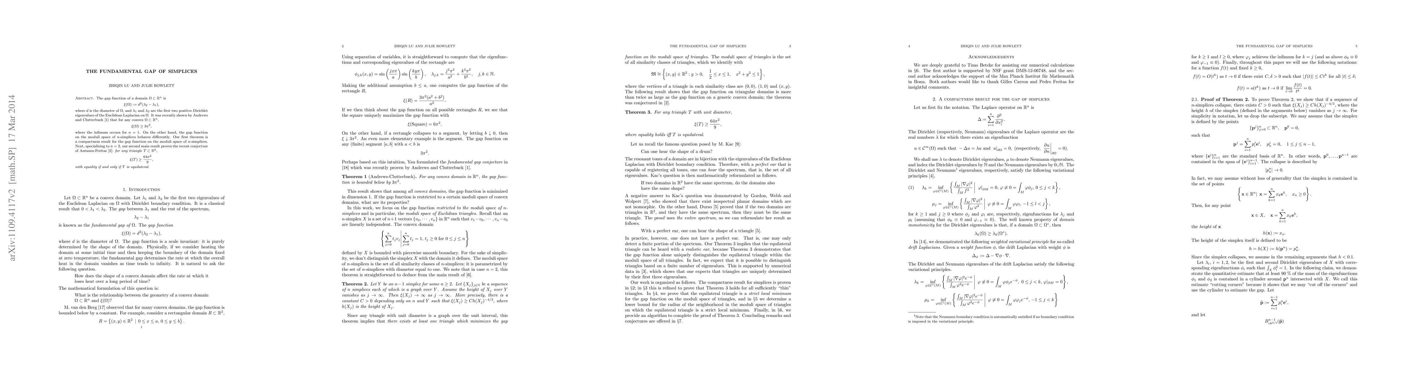 Researchers prove that for Euclidean triangles with a unit diameter, the fundamental gap is minimized when the triangle is equilateral, and establish a compactness result for the moduli space of simplices in all dimensions.